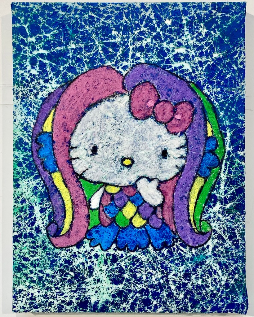 The past two Amabie paintings entailed a little girl (Little One) which was wonderful but this time I wanted to do something different. Whilst on the subject of Japan, I thought why not introduce my favorite character, Hello Kitty? It’ll be an interesting combination of traditional and modern. I then set about searching on the internet about Hello Kitty dressed as Amabie and sure enough I found a very cute one! Her printed image was then transferred on the paper with some tracing paper, then further outlined over with a permanent black felt pen. Isn’t she adorable?