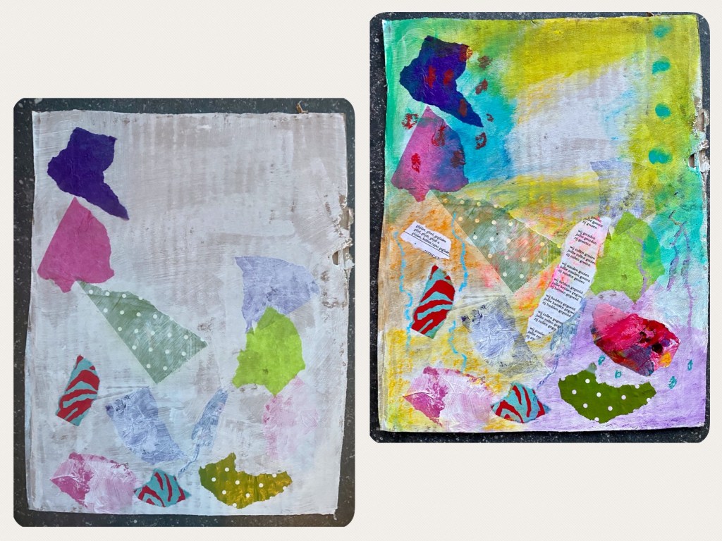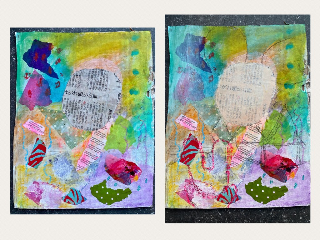 We worked with a substrate which I’ve never got around to trying: a scrap piece of cardboard from an old box! How interesting is that. I remember seeing works at an exhibition of a Japanese artist, Ayako Rokkaku, on which she used cardboard. At the time, I thought it was a brilliant idea but forgot about it over time, and now this was an opportunity! A layer of white gesso was applied on the cardboard which, though not necessary, is preferred for a longer lasting painting. After letting it dry, I glued on some collages of various papers including wrapping paper, mulberry paper and wrapping tissues as well as texts ripped out from old books. Then a variety of mediums were added layer after layer: oil pastels (by Art Philosophy), water-soluble sticks (Derwent’s Inktense Blocks. and some gouache.