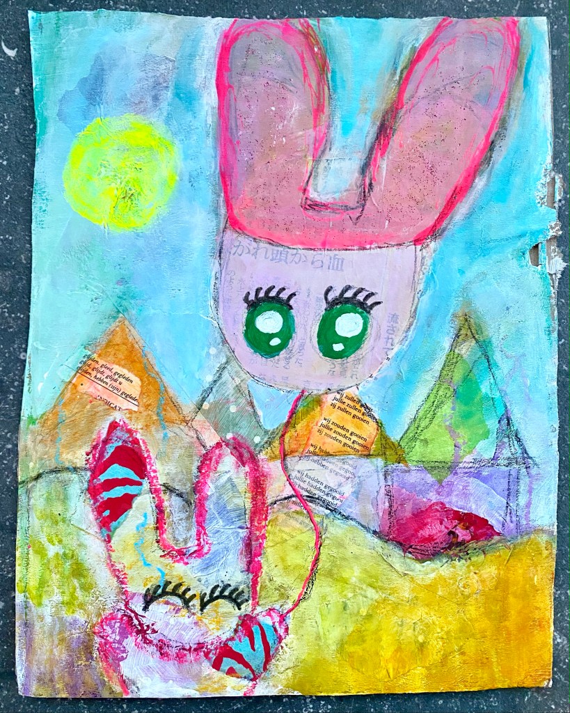 And now that I was ready to introduce my character, I cut out a circle from an old Japanese newspaper and glued it on a blank space intended for the head. I was at this point not sure what to create but since the face was positioned low enough I thought a bunny would be a cute idea. Hence, an outline was drawn in with a black marking pencil before coloring in with acrylic paint. I also decided to work on the background a bit and sketched some houses with the pencil followed by a smaller bunny this time drawn with some fluorescent pink oil pastel.