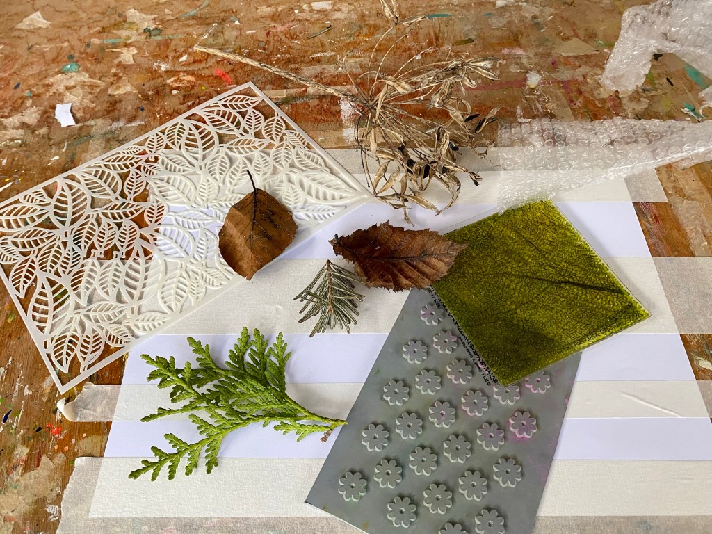 Still having fun with Tracy Verdugo’s Abstract Mojo classes and the other day enjoyed the next lesson called Nature Collage. Here we complied some mark-making tools pertaining to nature and created some nature-themed collage papers to produce another interesting abstract painting. Let’s see what I’ve done here!