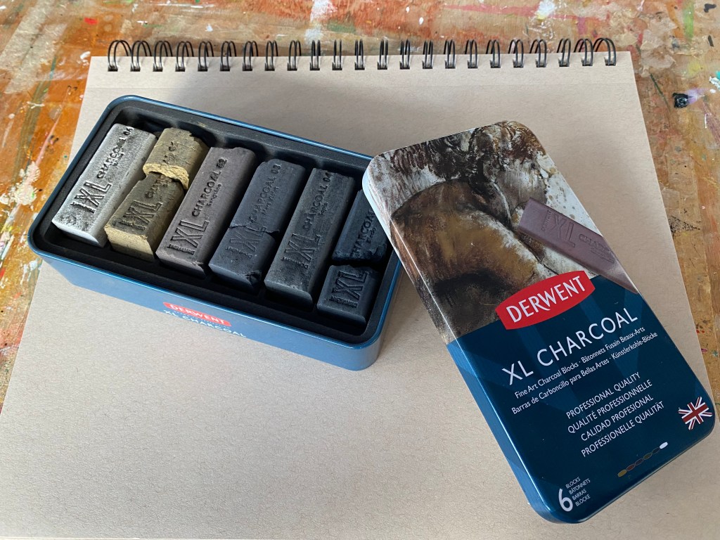 So how to draw her? Some time ago, I came across a tin of Derwent’s XL Charcoal on the internet and got a bit curious. I already have the XL Graphite in my possession which I was happy about and hence wanted to get hold of the charcoal version. These are big fat blocks of charcoal in square/rectangular form which come handy when you want to not only sketch something but also fill them in. Colours: White, Ochre, Sanguine, Mars Violet, Sepia and Black. Having ordered them from a webshop, I was disappointed that they arrived all broken and consequently messy in the tin. I returned them, got refunded and tried another shop. Same problem. Some blocks were broken in two or chipped on the sides. At this point, I decided to accept the situation and continue using them. They will one day get all broken soon anyway I thought.