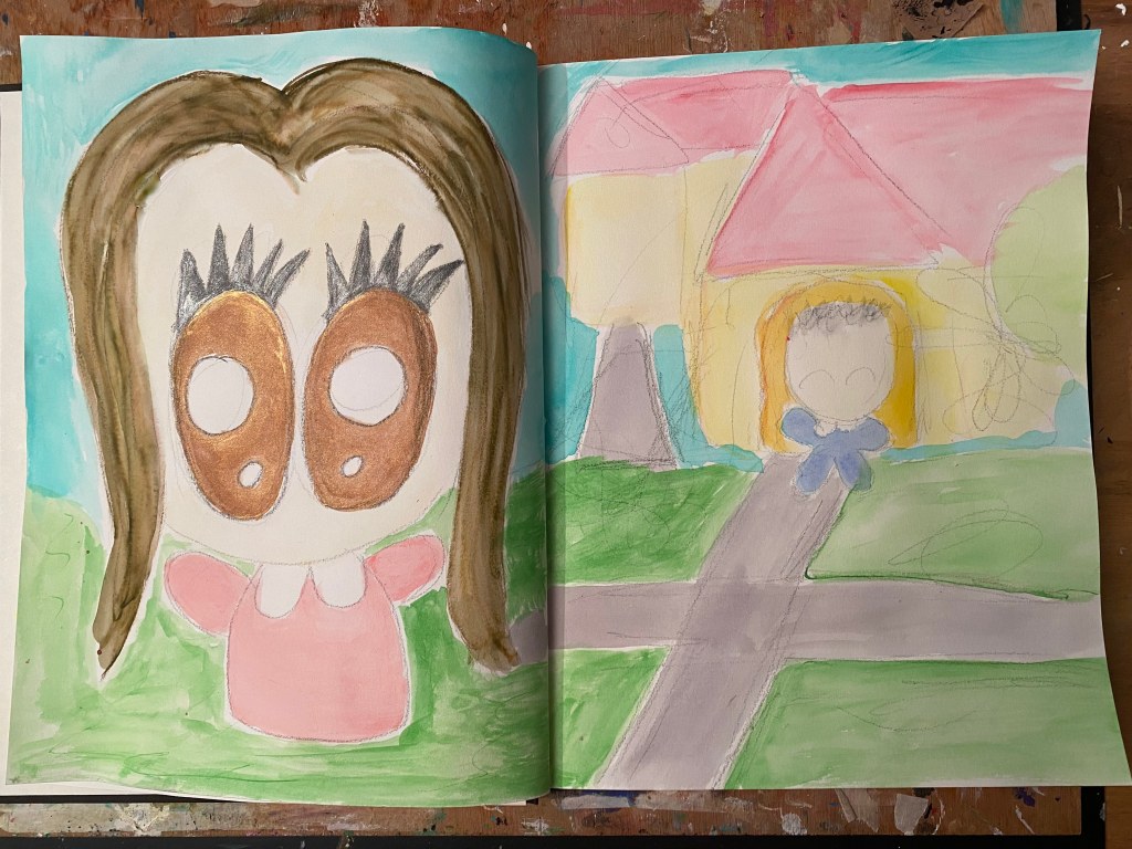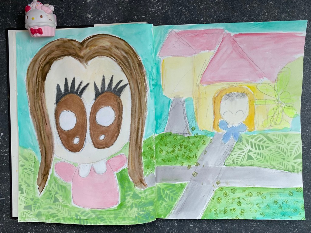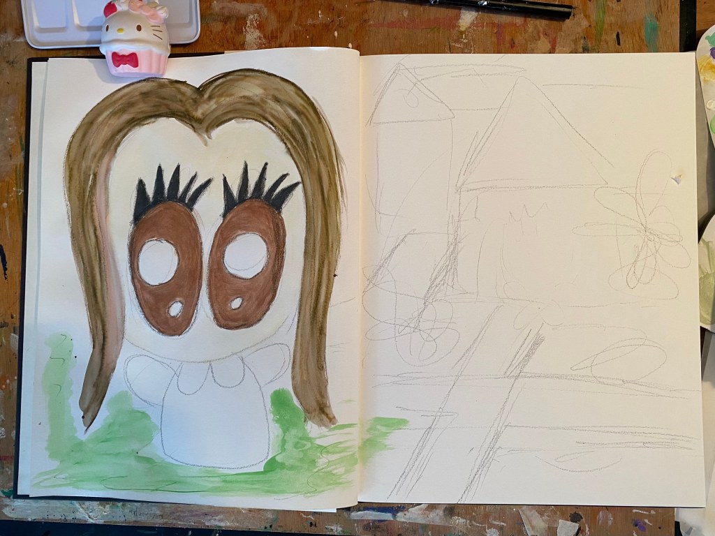 This piece was not even planned! I merely began by painting a large image of Little One (my alter ego) on one side of the page spread and taking it on from there. For this, I firstly sketched in pencil then filled in the face and hair using small tins of craft watercolors by Prima and Jane Davenport which I use mainly for journaling. Once I was almost done, the thought of our home and backyard came up which I then pencil sketched on the other page.