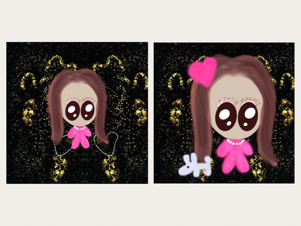 So far so cute! However, I decided to switch her outfit from red to pink. All I had to do was drag with the pencil the desired color swatch to the area, and it will automatically fill it in. Now that’s better! Yet another add-on brush I found interesting to use was the “28 Realistic Fur Brush” which I used on the outfit. Once I merged together all the layers pertaining to Little One, I expanded her in size so she’d fill the paper up more. A dog was then introduced (how could we forget this “fashion accessory”?) as well as a heart, and there I also incorporated some fur texture for fun. And now we’re talking!