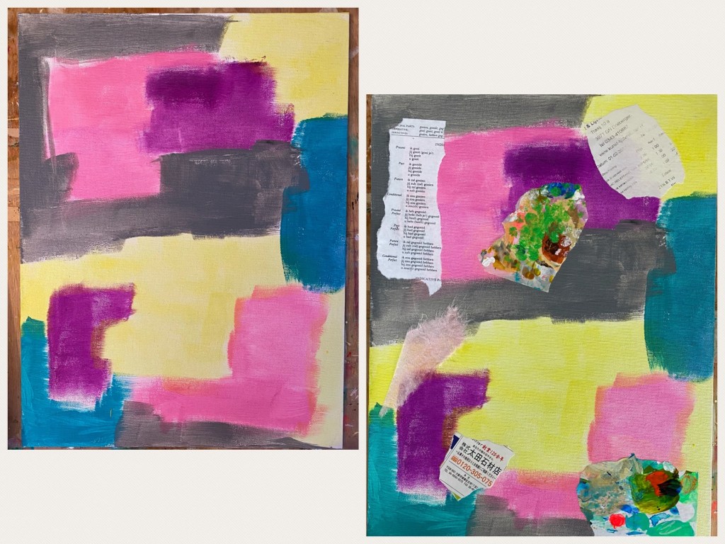 Juliette describes this class as “In this project we’re going to take more elements from our past work to strengthen our style. But instead of focusing primarily on visual elements, we will be focusing on developing a feeling.” On our canvas board, we begin by painting random blocks of color. I used some Rangers Dylusion’s Paint which are actually acrylic paint used for crafting. I bought the jars many years ago but decided to upgrade to a more professional set of paints but rather than throwing away the old stuff, I just try and finish them up especially as they get covered up later anyway. Plus, I love the colors! Once dry, we proceed in glueing on some collages. As you can see here, I tore up bits of scrap mulberry paper, used up palette papers, Japanese-language newspaper and pages from my Dutch grammar book no longer needed. Adds some flavor to my paintings!