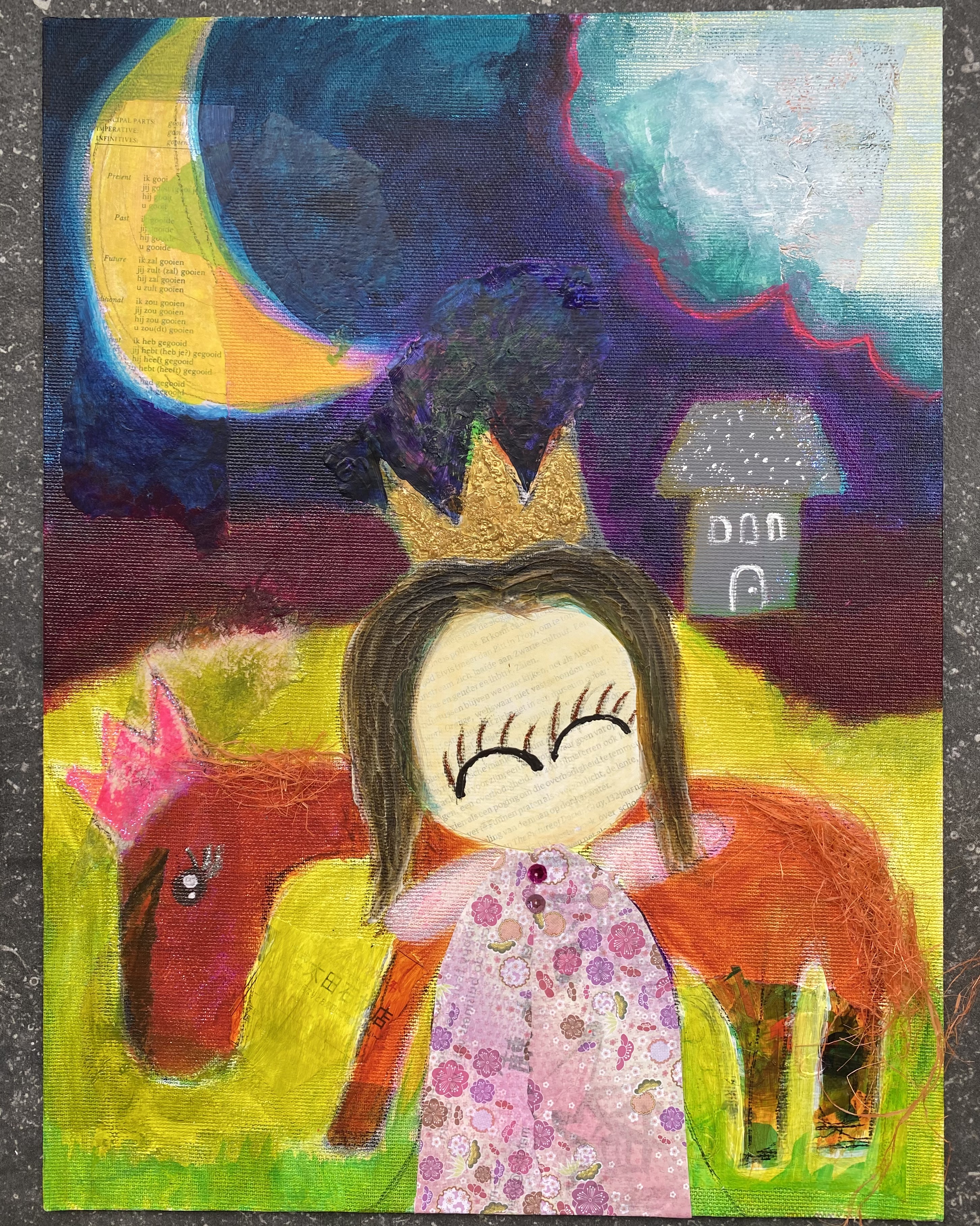 More collages continued being added including wrapping tissues and patterned paper napkins. And now I was ready to go for my subjects! Somehow, I thought that purple rectangle with a bit of pink collage paper could develop into the figure of a downward facing pony. The pony was then painted in Quinacridone Azo Nickel Gold. See how the back legs still show some patterns from the underlying layer! I then decided to emulate Juliette’s painting a bit and get Little One to be princess and pose in front of the pony , thus adding a cut-out circle made of newspaper for her face. The rest then flowed in: I sketched in her robe, the shape of the pony and painted the surrounding background in Green-Gold. Face and hair colored in. Seeing it’s been a while since I last used modelling paste, I thought this was a perfect opportunity to add some texture to the hair. Then the crowns for both the pony and Princess Little One were then added. How cute!