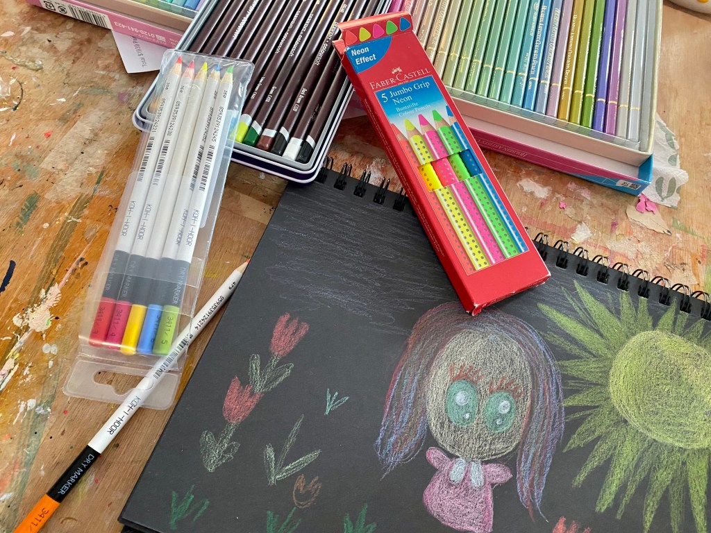 I enjoy the occasional black paper art. Whilst the colors pop out even more than on white paper, the whole atmosphere has an aura of mystery. Best mediums for black paper include colored pencils and pastels and as for paints, acrylic and gouache. For this drawing I used a page from my Black Paper sketchbook by ArtGecko and a variety of colored pencils including Holbein’s Artists Colored Pencil which also includes a wide selection of pastel shades, some fluorescent varieties by Faber Castel and Koh i Noor and of course a good quality set of plain colors such as Derwent Colorsoft.