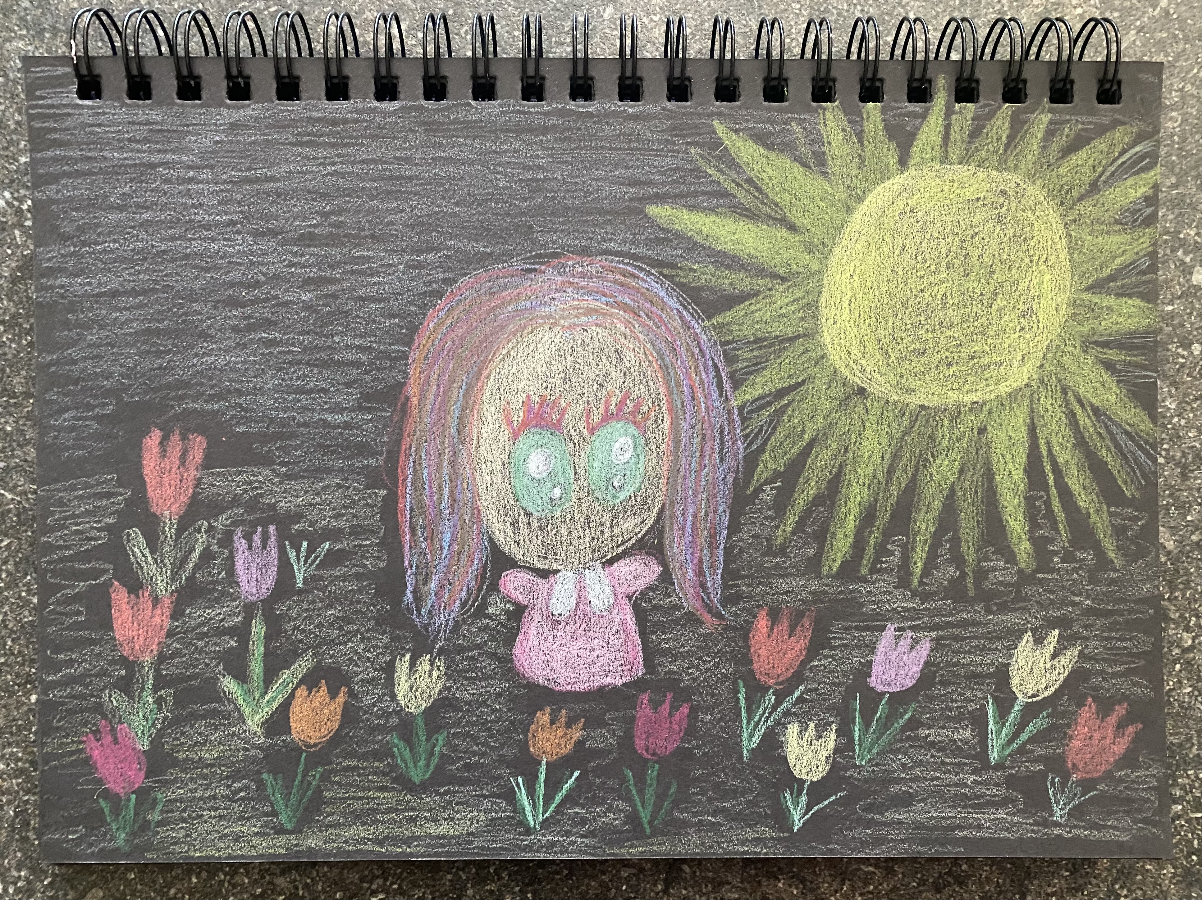 And what fun that all was! To be honest, I hadn’t planned what exactly I wanted in my sketch and just went for what was in my head. First thing that came to mind was the sun, and then Little One of course. How could I not include her! Then everything else fell into place. The tulips were added one by one in various shades of orange, red and pink as well as a little yellow. When it was time to do her hair, though, it looked a bit boring with just brown on the black paper and hence I threw some blue and pink. I also switched her eyes to green in place of the usual brown just to enhance the colorfulness of the drawing even more. The background was then roughly scribbled in light pastel blue and green. And now… Little One enjoying her little tulip garden!