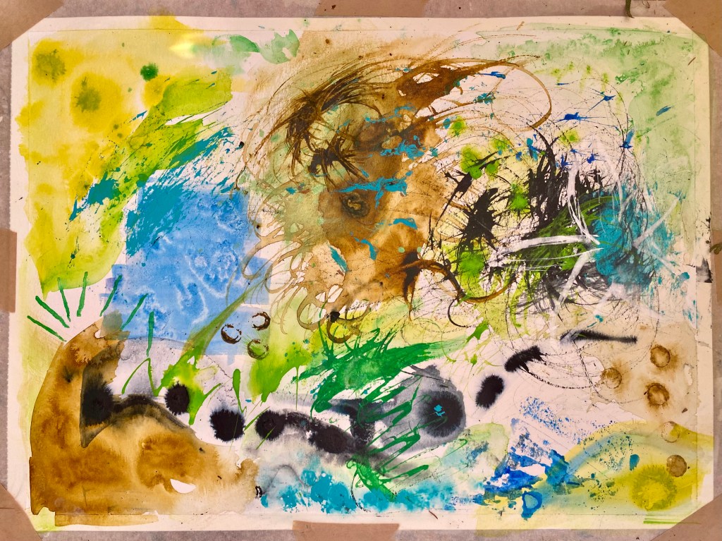 Another fun and inspiring session with Tracy! Using nature tools was quite a wonderful change to brushes and hands. Who would have thought! As we now have a wonderful garden and are surrounded by nature, I should make use of what I have more often. The colors are also not the typical ones I use in my work which makes it all the more interesting as I once again got to explore beyond my comfort zone. In addition, it was a pleasantly therapeutic experience getting in touch with the nature around us. I should do this sort of painting more often!