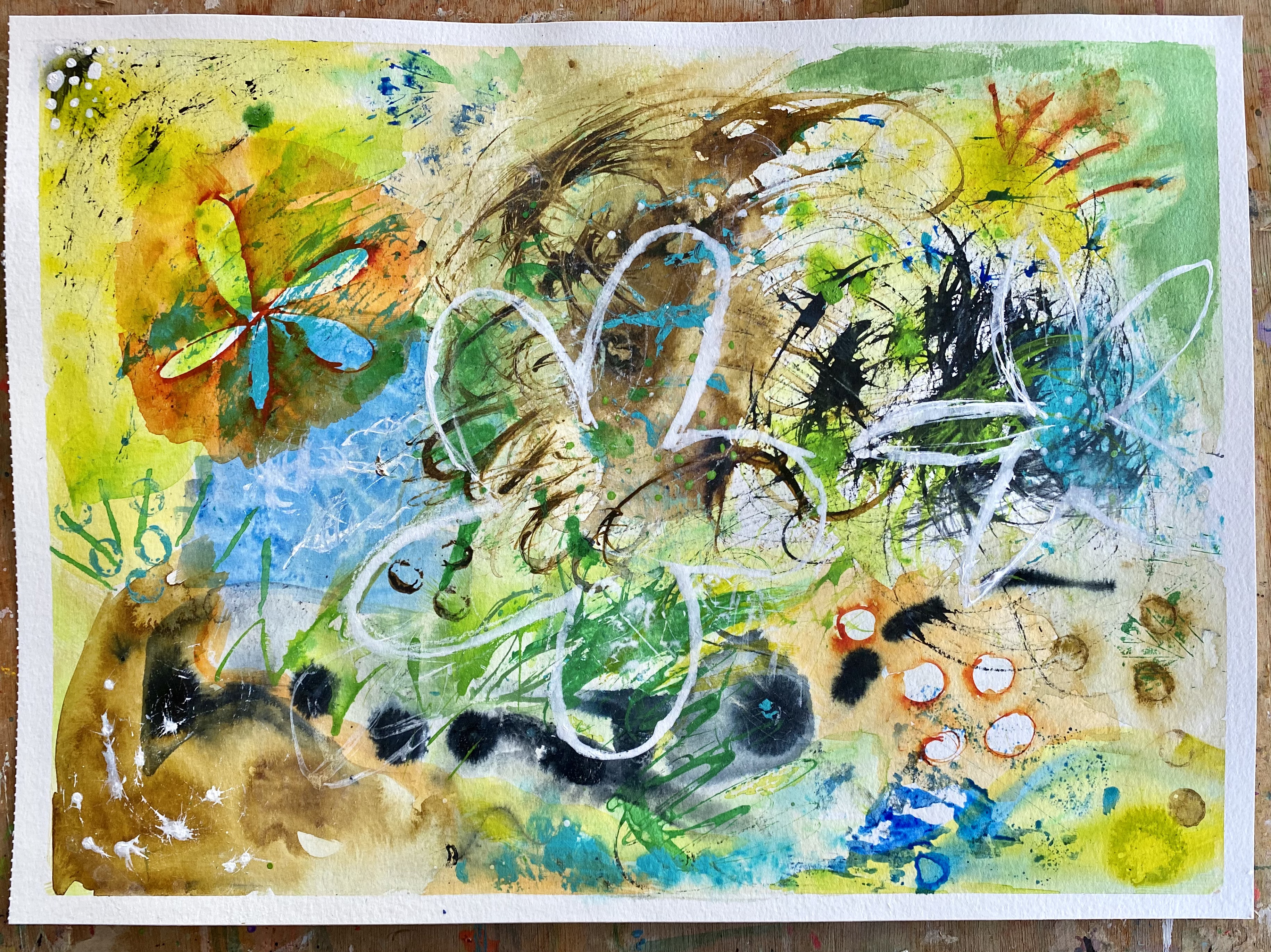 Following my last blog, things have not gotten any better regarding the sale of my apartment. It really looks like I need to put it on the market again which is a pain. But I need to move on and focus on happier things in life. So today, I decided to write about a painting I did a month ago whilst following another of Tracy Verdugo’s Abstract Mojo classes, this one called “Nature Tools”. What perfect timing to write about it now because just this morning, I decided to get active (vent my frustrations rather) and do a jump-rope workout in our own back garden! And then I remembered how lucky I am being surrounded with such a beautiful nature around me, making me forget my troubles.