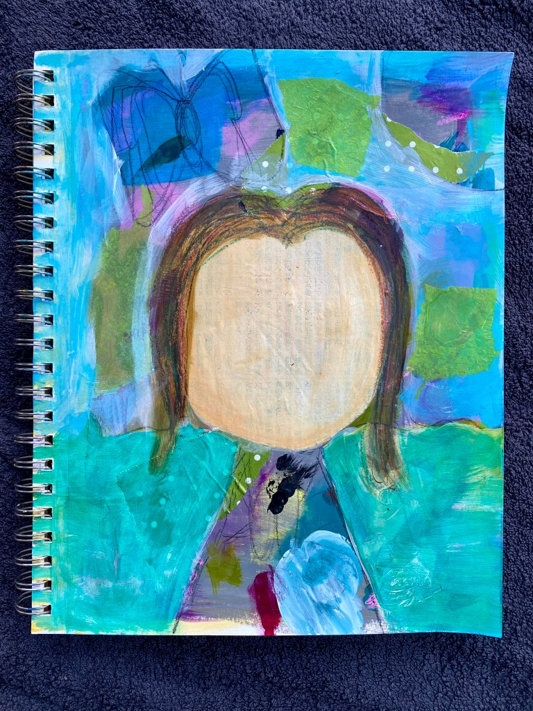 Once I had a better idea of my painting, I created the sky by painting around the butterfly and sun, and further colored the ground first in yellow but as I didn’t like it, I layered on top with teal. The negative space effect is looking great! Hair was painted in, followed by gluing some torn bits of green wrapping tissue for some atmosphere. So far so cute!