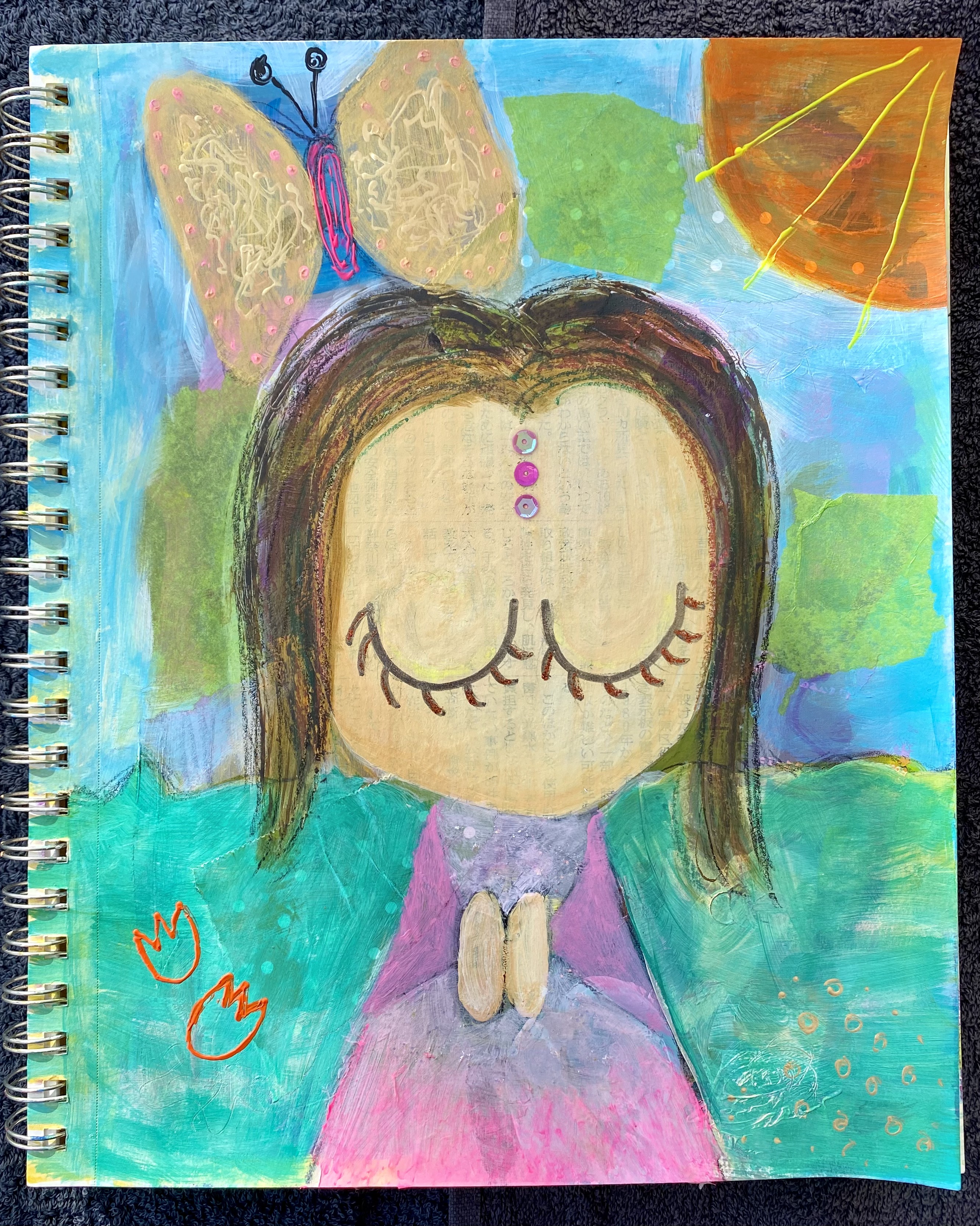 Once I was happy with the background, all I did was fill in the subjects and add details. I made the robe various shades of pink, the butterfly gold and the sun orange. Sennelier’s 3D Liners and glitter glue were then used to add some texture. What is important here is being able to pair the colors in opposite areas of the page so that the painting has some unity. For instance, the fluorescent pink on the butterfly matches the bottom of Little One’s robe, the orange sun and the orange tulips and so forth. The final touch was the trio of sequins on the forehead. I always feel sequins and glitter add to the cuteness. And here we go!