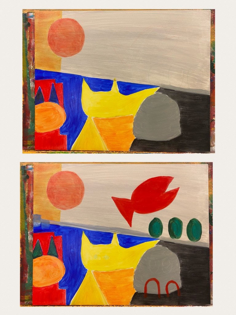 And here are my little cats and kittens going underground and hiding whilst preying for that big fish jumping up in the air. And who are they accompanied with today? Their little friend, Pet Rock! Another painting from our Tuesday evening abstract art classes. And the first one with water-soluble oil paints. How exciting is that! Another excitement is developing ideas by inspiration from other artists: This time it’s the turn of Corneille, another COBRA artist.