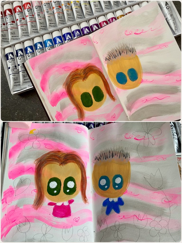 I’ve always wanted to paint with gouache on top of an acrylic background. Holbein’s Acryla Gouache was introduced here, although they are not strictly gouache due to their high acrylic content and hence water resistant. Traditional gouache is actually water-soluble. Nevertheless Acryla equally gives a matte and chalky finish and a thick opaque appearance, working well on top of acrylic. As you can see, I’ve started with painting us first, and as I was pleased with how we turned out, I proceeded in adding flowers. A variety of surrounding flowers and plants were then sketched with pencils. So far so kawaii!