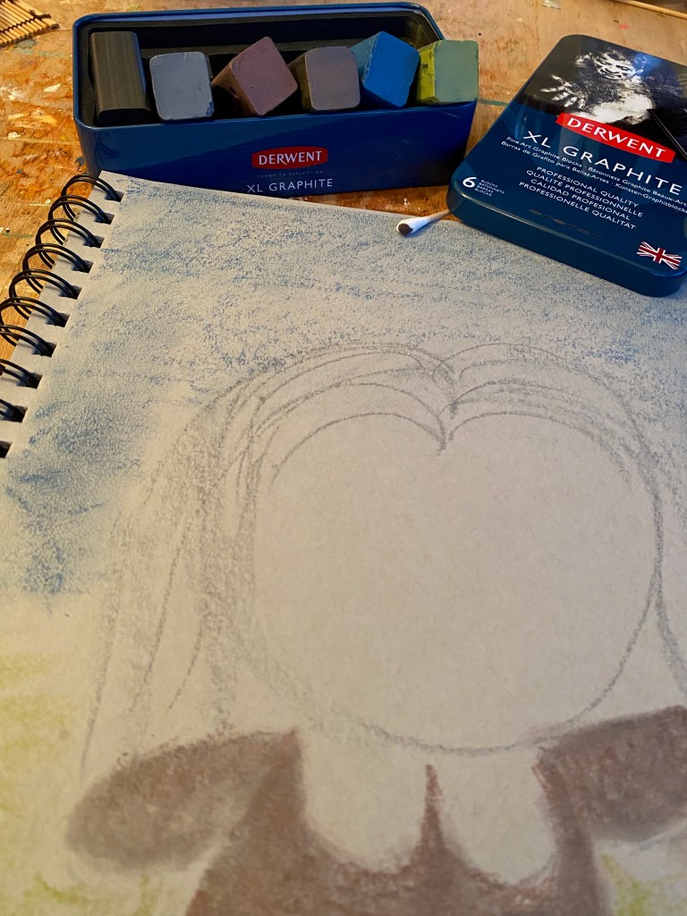 And of course I wanted to sketch about it: Little One proudly showing us her new present! A few art supplies sit in my drawers waiting to be used more often, and among them is a tin of Derwent’s XL Graphite blocks. As illustrated below, they are a set of six chunky graphite sticks that come in rather limited shades of Very Soft Black, Soft Black, Burnt Umber, Raw Umber, Dark Prussian and Olive Green. I’ve used them before but this time I wanted to try them out on some Toned Grey paper and see how they look. And hence I started here.