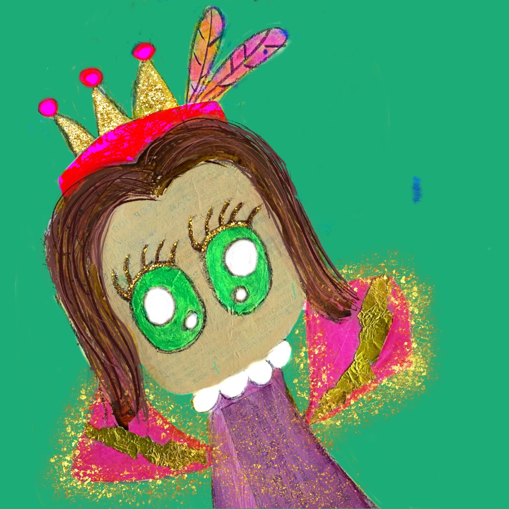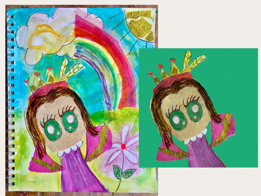 On the Procreate app, I imported the photograph of the painting and with the Eraser, carefully wiped out the background so that only the subject, Little One, was left. The colors are already quite vibrant, and we have some metallic collages which is a good start. For now I made the background emerald green.