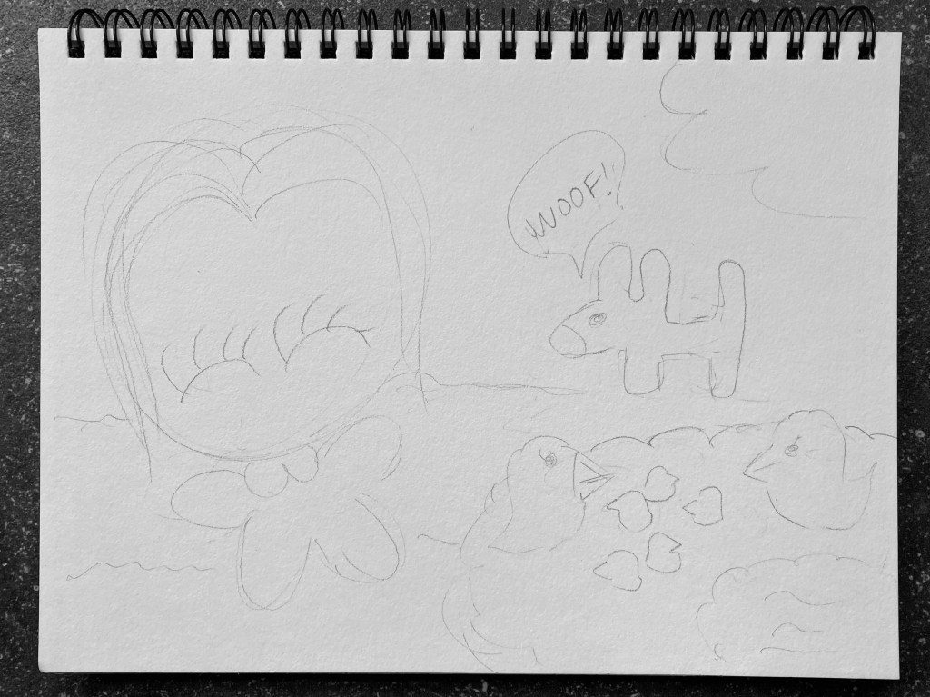 For the rest, I primarily used my pan of Kuretake Gansai Tambi which are the traditional Japanese watercolors derived from natural dyes. The vibrance of pigments is quite amazing. Just for Little One’s dress, though, I went for a pastel pink shade from Holbein’s tube of watercolor. The color of the nesting area, though was changed; I went to the brook and noticed that the area was based on long grass and hence decided to make it green instead. Not to worry, I glazed over the outer area with the remaining blue from the Hydrus liquid watercolor and was able to scrape some remaining colors from the mixing dish from a previous painting. Rather than use a marker, I used a thin brush for the eyes and the caption “Woof” this time.
