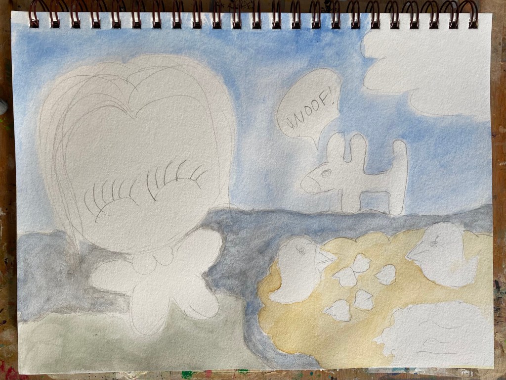 Another cute little painting featuring animals again along with Little One! So much fun experimenting with various forms of watercolors (liquid, pans and tubes). The colored pencils came in handy, something I like combining with watercolors. And this is my first painting out of the Baby Bird project, and I am definitely looking forward for more. Little One and the neighbor doggy are meanwhile enjoying being featured in another painting again and seeing the newborn birds. “Let’s see more baby birds!”, she squeals.