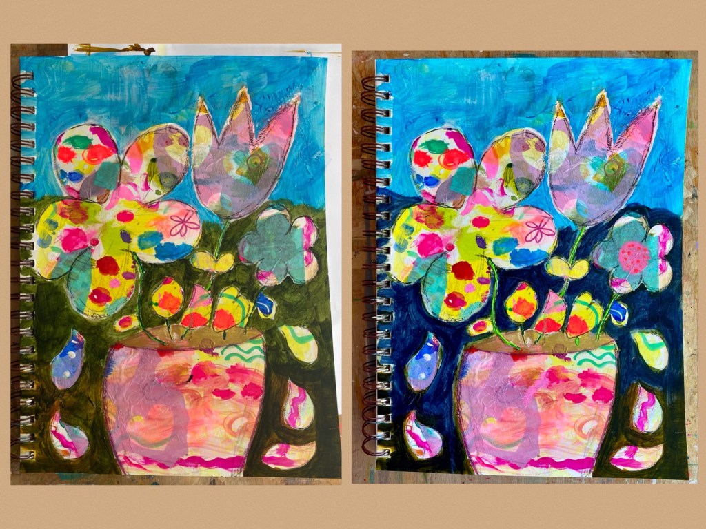 And now for some finishing touches, mainly adding texture. With a selection of colors from Acryla Gouache, I painted in the center of the larger flower. The thick consistency of the gouache provides some wonderful textures to the painting. The stems of the flowers were further enhanced with some dark green Amsterdam’s Relief Paint in combination with the earlier-used 3D Liner. Another of my favorite texture in my paintings is glitter! With the tulip needing a bit of uplifting, I outlined it with some light pink glitter glue (Ranger’s Stickles). The pot was also outlined with some glitter pen in dark pink. Then around the sky, I applied some blue glitter gel (Stickles). And now!
