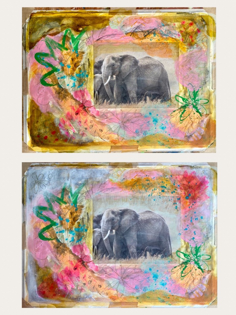 New lesson of Tracy Verdugo’s Abstract Mojo classes! In this unit Creating Story, we create an abstract painting based on a photograph as center piece. Tracy herself used an old vintage photo, whereas I found an amazing photo of an elephant in a wildlife magazine focused on saving animals. Let’s see what we come up with!