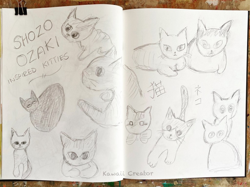 I’ve been following and been inspired by the works of Japanese artist Shozo Ozaki. Having come across him on Facebook, I was well impressed with his focus on cats. Just simple sketches, ink drawings and watercolor paintings of them in different shapes, sizes and forms including various poses and positions. As you’ve gathered, many of my characters are in a standing position and observing Ozaki’s work certainly opened up my horizons. It then dawned on me that introducing other posing variations would add more to my work. So why not start practicing? And now the sketchbook and pencil as I doodle away!