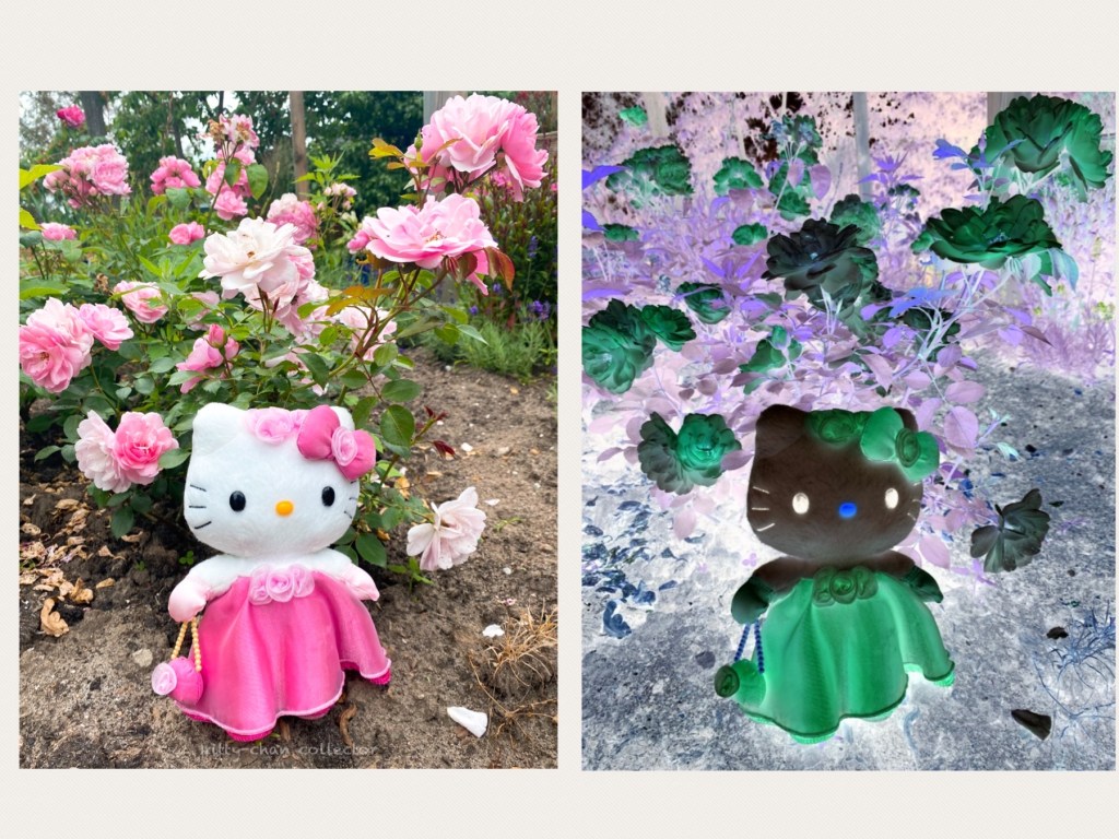 And why did I choose to be different? It was purely by chance. To be honest, I was unable to find any suitable “vivid colored” photograph for this purpose for class and was reluctant at the time to download another app on my phone. I did however love the Hello Kitty photo I took the other day of her standing in our garden surrounded by roses and would have loved to paint about it. Whilst the existing photo apps I have had limited options for anything inspiring, I discovered that the Line photo app enabled me to make a “negative” version of photos! Roses became green, and Hello Kitty goes black. How cool would that be to paint…
