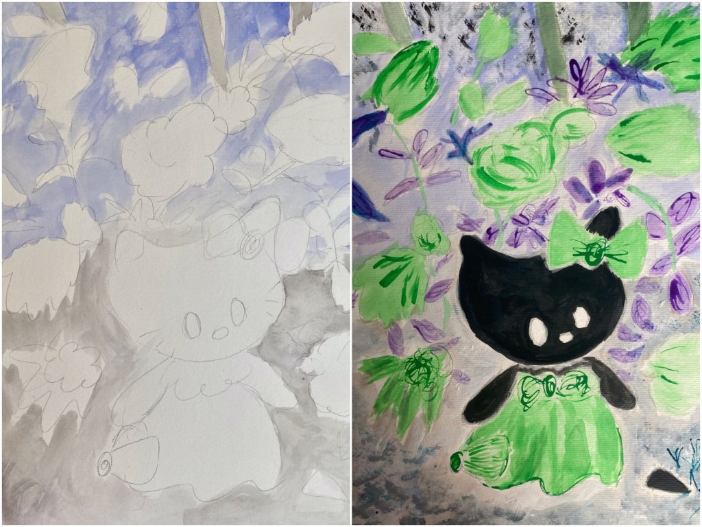 Once I was happy with the sketch, I began painting with acrylic inks. Harmonious shades seemed to be the theme here along with a variety of tints and tones. Hence, a selection of inks included purples, violets, blue and green along with white, grey and black. I first began with the background as a basis working my way through the flowers and Hello Kitty of course. Wow, I do love the black!