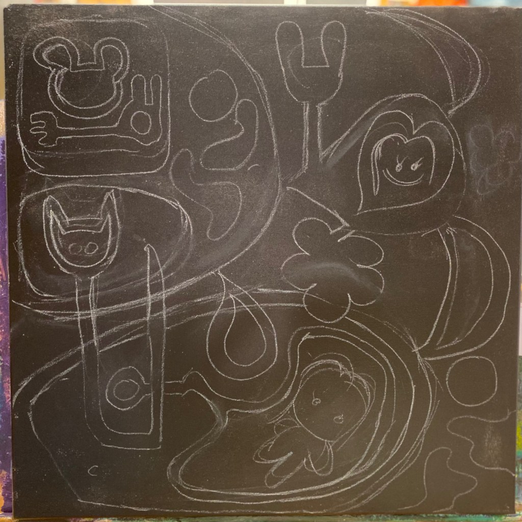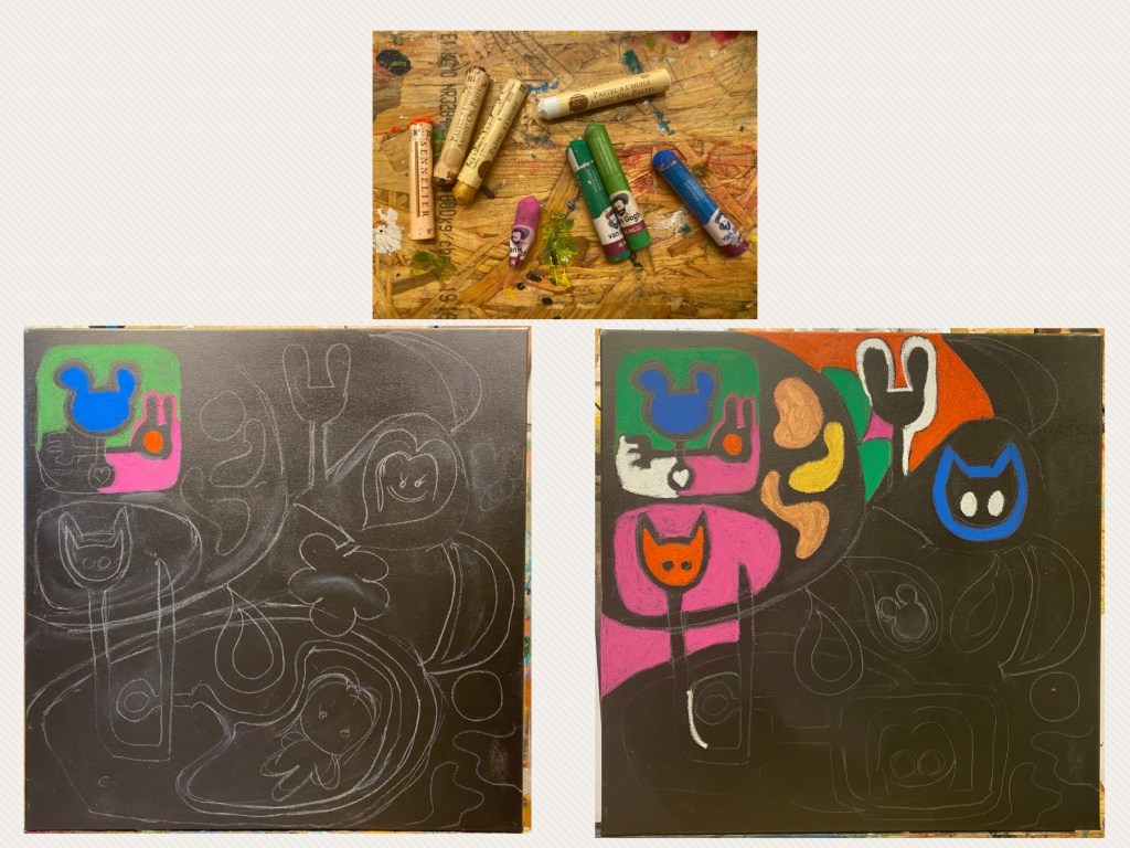 My version was to be on a huge square canvas using oil pastels. First the black background required completely covering the canvas with black acrylic paint. A roller was used for this to ensure even coverage and thickness without any bumps. Once I let it dry, I was good to go! My idea was firstly scribbled on a piece of paper before transcribing it on the canvas. Then once I was happy with it, I carefully sketched my outline with some white chalk pencil which could easily be erased for mistakes. And here was such a great opportunity to be so free! Random cats, teddies and bunnies, not to forget Little One!
