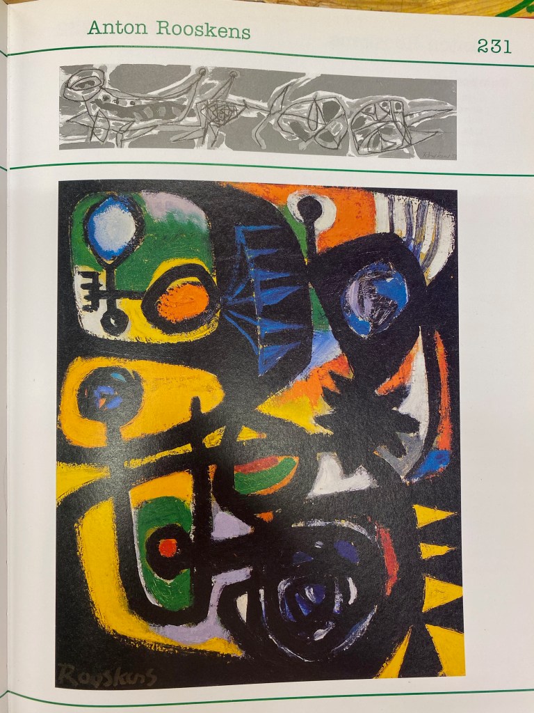 During my years at the classes, I got to discover and appreciate the works of some modern Dutch artists. The COBRA (Copenhagen-Brussels-Amsterdam) movement came about in the 1950s, a time when Europe was picking up the pieces after WWII. By then came the sudden burst of creative freedom following the repressive mood during the war. And what a burst that was! All the beautiful abstract works blossomed, many of them being somewhat inspired by children’s drawings and primitive artforms. This of course translates to “kawaii” and simple (in a positive way), which naturally drew my attention. One of such artists in this movement is Anton Rooskens (1906-1976) whose work also inspired me with all the circular shapes, bold strokes, vibrant colors and mysteriously hidden facial features: