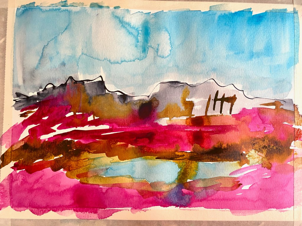 Great to be back following on-line classes after a big break! The other day, I decided to resume Tracy Verdugo’s Abstract Mojo classes. Introducing here a quick but fun painting from Unit 5 Lesson One “Abstracting the Landscape”, which was quite good timing because I have loads of beautiful landscapes from my holidays in France to share! The objective of the lesson was to revisit the line and color studies from the past lessons and as Tracy quotes “the use of dynamic expressive areas of color and mark making against more solid flat planes and how a balance of the two can make for a stunning successful abstract painting”. Sounds exciting!