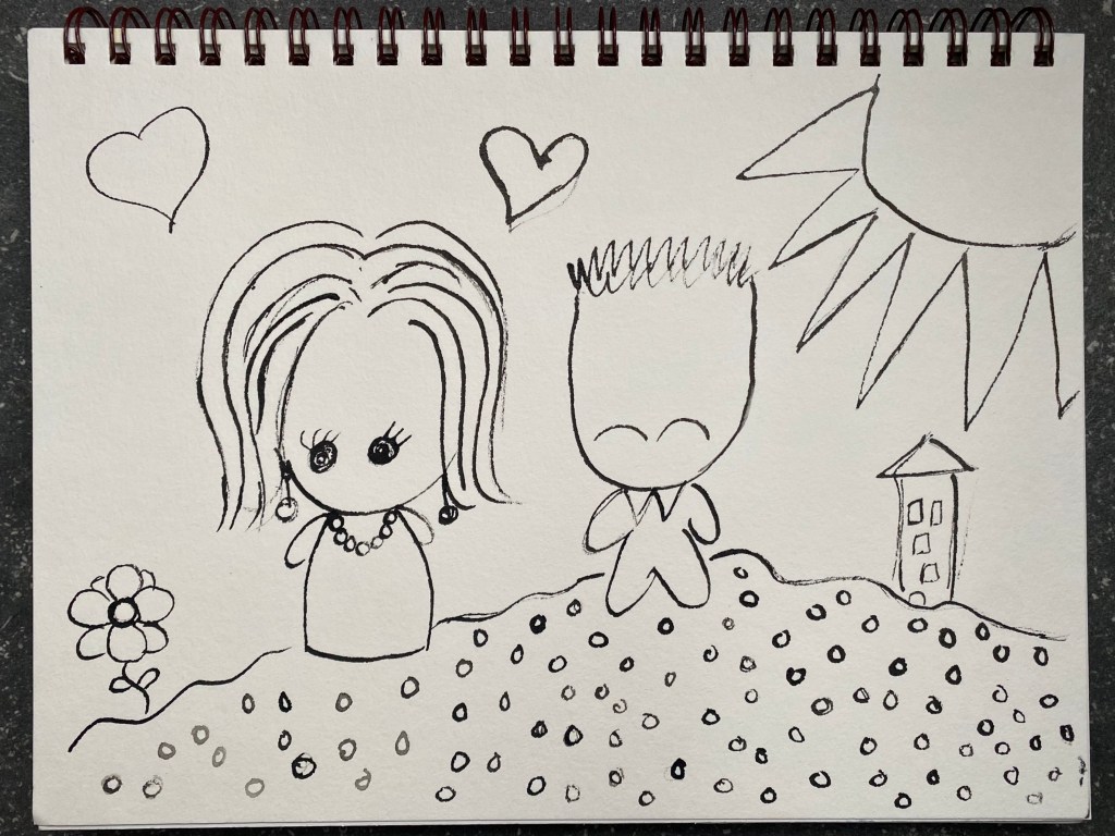 This painting certainly was about using leftover art supplies too! I had two dishes with some dried up watercolor paint from tubes which I wanted to finish up so as to make room for future fresh paint, ie. making one dish for watercolor and another for gouache only. As such, the sketch was filled in with the leftover paint, starting with the background then the subjects. The grass, however, was colored green with Derwent’s Inktense, a water-soluble medium, since none of the leftover paint had the color I had wanted and there was not sufficient blue or yellow to mix together to make green. The faces were also painted with Inktense. And here is the start: