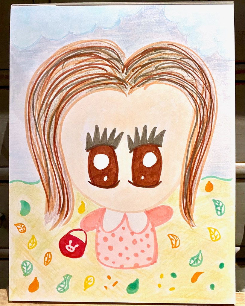 Little One is missing the warm summer months but is getting used to the change in season. It’s now Autumn and the leaves are changing colors. She finds that really cool to look at! Today, she was in the mood for a walk through the park on this unusually sunny day. A bit of clouds about but pleasant enough for a stroll. And what has she with her? A little red handbag she got during the summer sale the other day! How cute, it even features a small pink teddy bear on it. And of course, I wanted to paint about how happy she is!