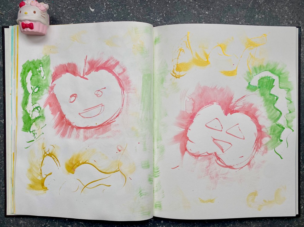 On a two-page spread of my Strathmore sketchbook, I began doodling away with the tip of the ink dropper from some of my colored India Ink. More precisely, they are the iridescent versions of Bombay Ink by Dr. Ph Martin’s which come in 12 shades. And they are gorgeous! Green, Salmon Pink and Yellow were chosen here, with some spread out with a small flat wet brush. As it turned out, I ended up with two pumpkins, one on each page surrounded by random shapes and curvy lines.