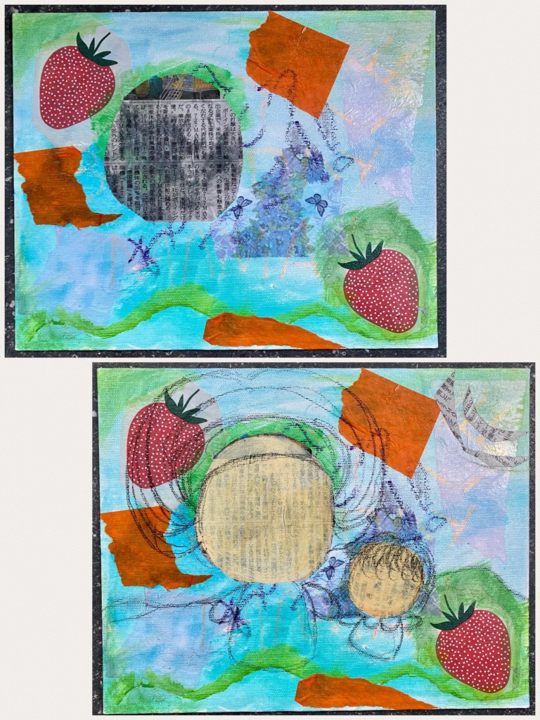 My intention was to display the painting visibly on top of our Butsudan which is a Buddha altar to pay respects to my ancestors, including Mama. Hence I needed a sturdy substrate that was neither too bulky nor large. An A4 size canvas board was perfect for this purpose. And now time to begin! Feeling rather emotional, this painting began with some intuitive layers of oil pastel doodles, acrylic ink splashes and collages. First came “Happy Birthday Mama” scribbled with neon orange oil pastels by OMY followed by three shades of blue and turquoise acrylic inks covering the board. Letting that dry, I went and wrote the Japanese translation of “Happy Birthday Mama”. This was followed by some strawberry collages that came from a wrapping paper. Strawberries were both our favorite fruit, and it was good timing I came across the paper. Then came some more random collages of wrapping tissue and a splash of emerald green ink. Great start!