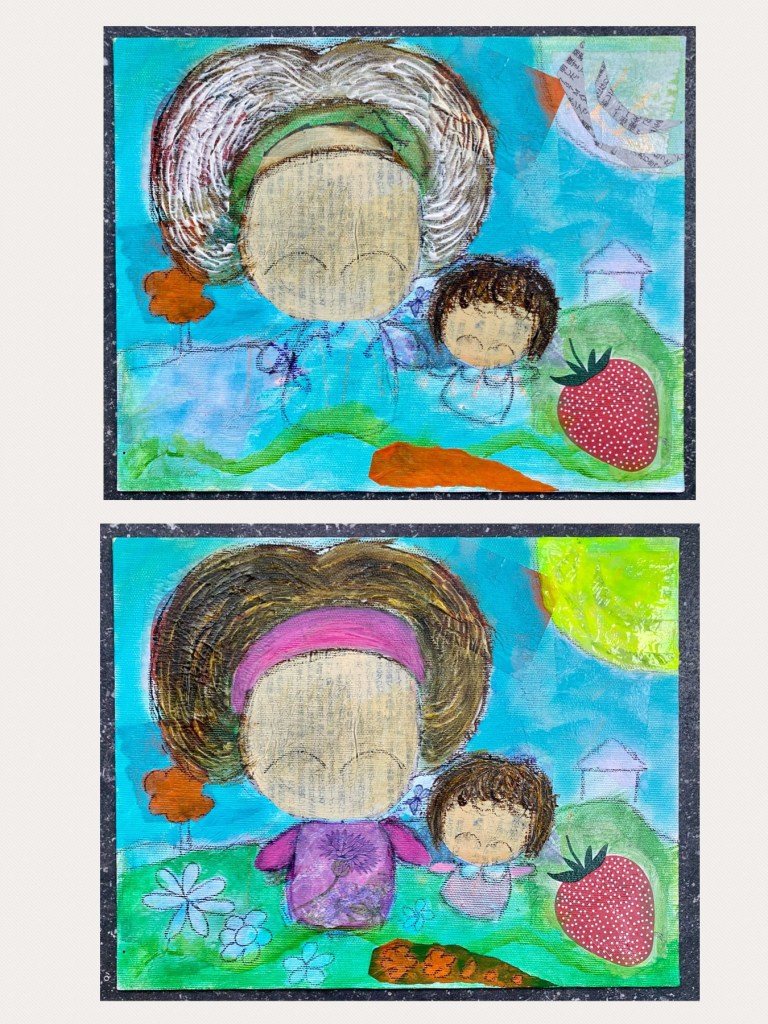 And here comes the exciting part. Painting us! I started with the background with a Teal sky mixed with Titan Buff and made room for the sun whilst creating negative spaces for the house, tree and small butterfly between us. The sun was then colored in by carefully spreading with a palette knife some fluorescent yellow paint mixed with Clear Tar Gel for some ultra gloss. And now I jumped onto the hair before going for painting the ground. For the hair I firstly scribbled a bit with some light brown and dark brown oil pastel to make the hair “strandy”, enhancing that further with adding some Antelope Brown and Payne’s Grey ink with the dropper. Modelling paste was then spread with a palette knife to give texture. I was not quite sure how the frontal area of my mother’s hairline would turn out and hence improvised and introduced a headband which was still quite a 60s trend, using Light Magenta Heavy Body acrylic and Quinacridone Magenta Fluid acrylic. Then I went ahead and painted the ground with a thin coat of Permanent Green Light as I already liked the bottom layer to show through. Before that though, I doodled some flowers with a marking pencil to make some negative space when the green is painted. And now our outfits! They were filled in with the two magenta shades mentioned, with mine just in Iridescent Pink ink by Daler-Rowney. Just to further enhance the 60’s look, I glued to Mama’s dress the flower part of a paper napkin, and how cool is that!