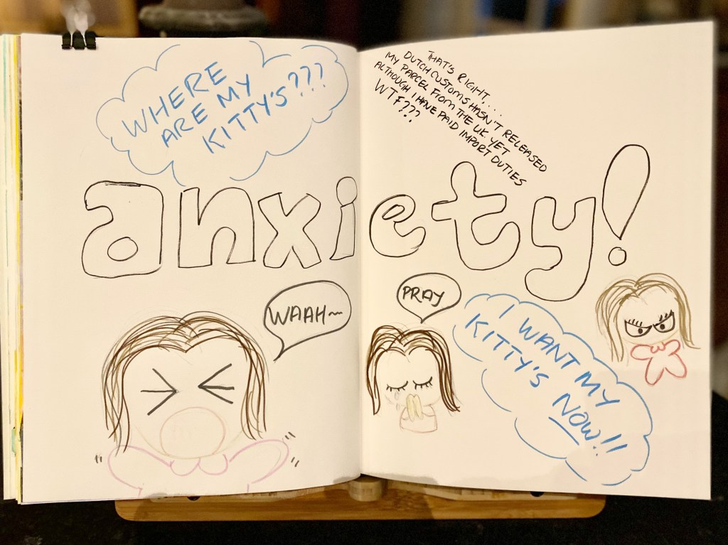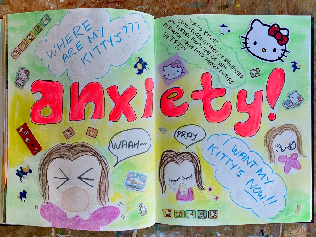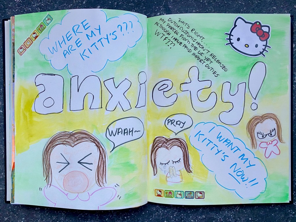 Another drama with online shopping. My stuff hasn’t arrived yet! Again the issue with the Dutch Customs holding my package for a few weeks. This time, though, I was charged import duties which I duly paid expecting it to be released immediately for delivery. But no… it has been over a week and it still hasn’t been released. 3 November duty was paid, 9 November the tracking tells me “Customs checking, delivery time unknown” and nothing since. Huh? The items are a series of heart-shaped AND Hello Kitty carved stone crystals not too expensive and certainly not a life or death situation but would be nice to have. Getting a bit anxious here! And so I thought a little art journal rant would help me vent my frustrations…