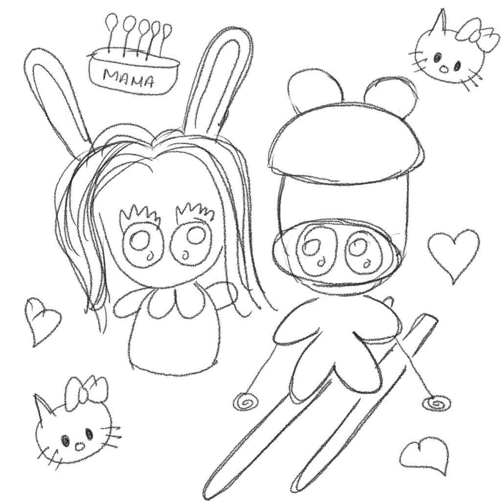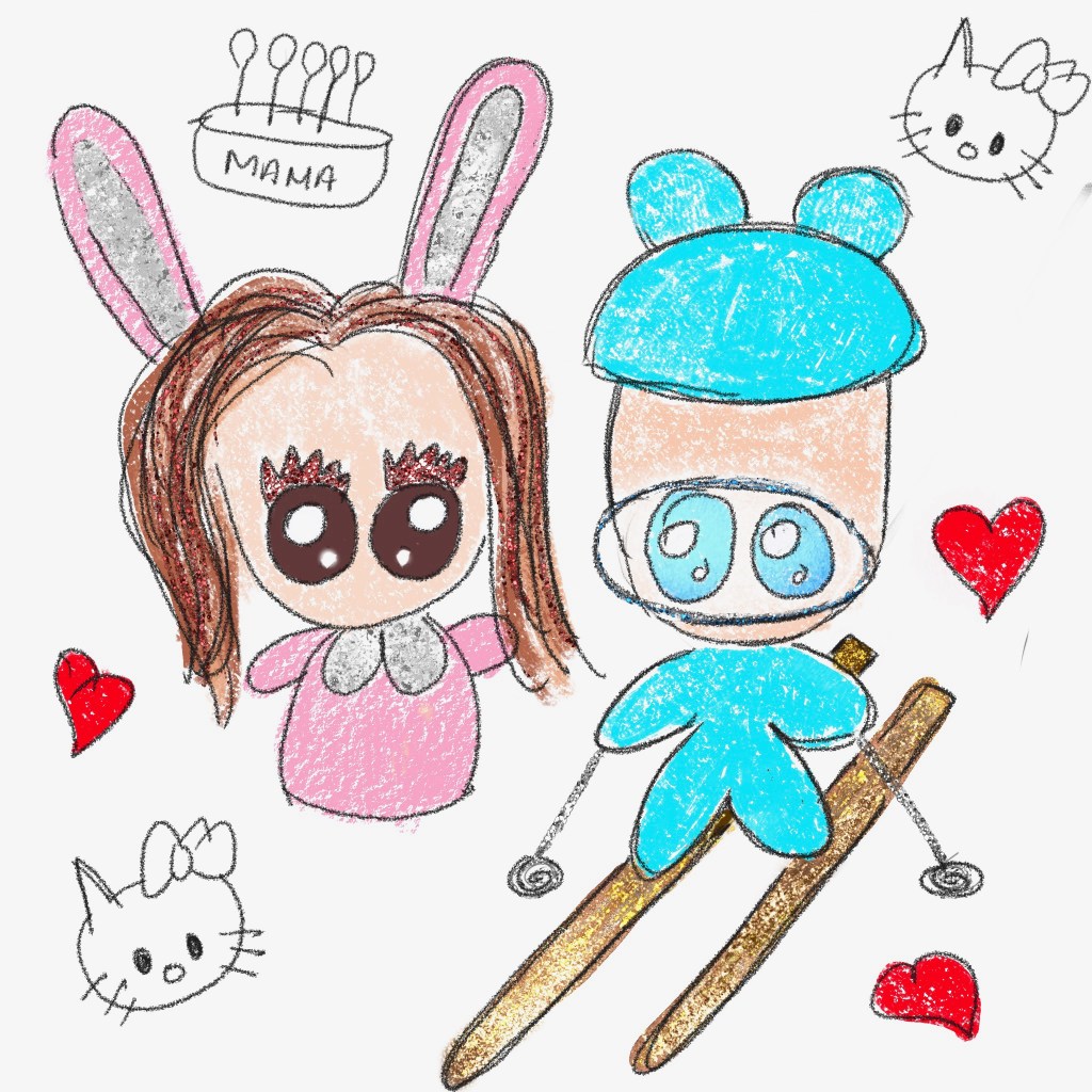 My paintings typically start with a pencil sketch as I’m not yet as confident with impromptu sketches as I would like to be. On square “paper” then , I sketched away with the Procreate Pencil depicting BF in his skis and me just hanging out at home with my newly-purchased Hello Kitty’s and commemorating mama’s birthday. Gonna make it simple and cartoony today by adding some bear ears for him and bunny ears for myself for fun. So far, so cute!
