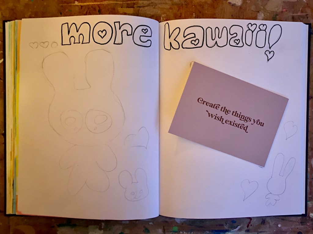 Opened my Strathmore art journal sketchbook and began sketching away on a two page spread. First thing that came to mind was “bunny bears”, a combination of bunnies and bears, something I indeed wish that existed. So away I sketched. Then I thought other characters should come to play, including Hello Kitty and…. Little One of course! How could we forget? And so I went for “… More Kawaii!” about creating things I wish existed and take it on from there. And there is the postcard, placing it where I was planning to glue it on later.