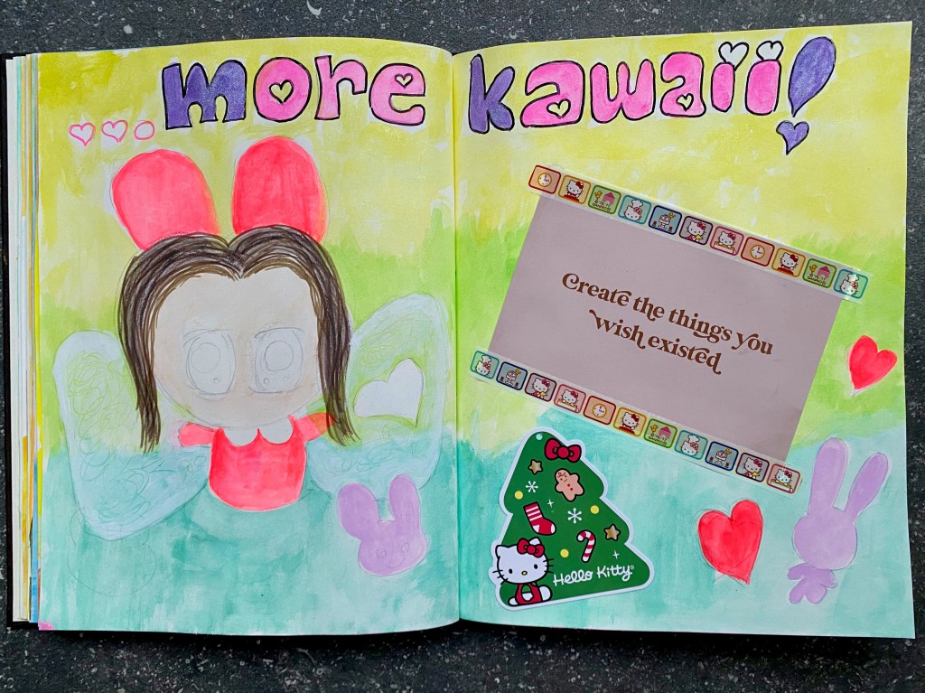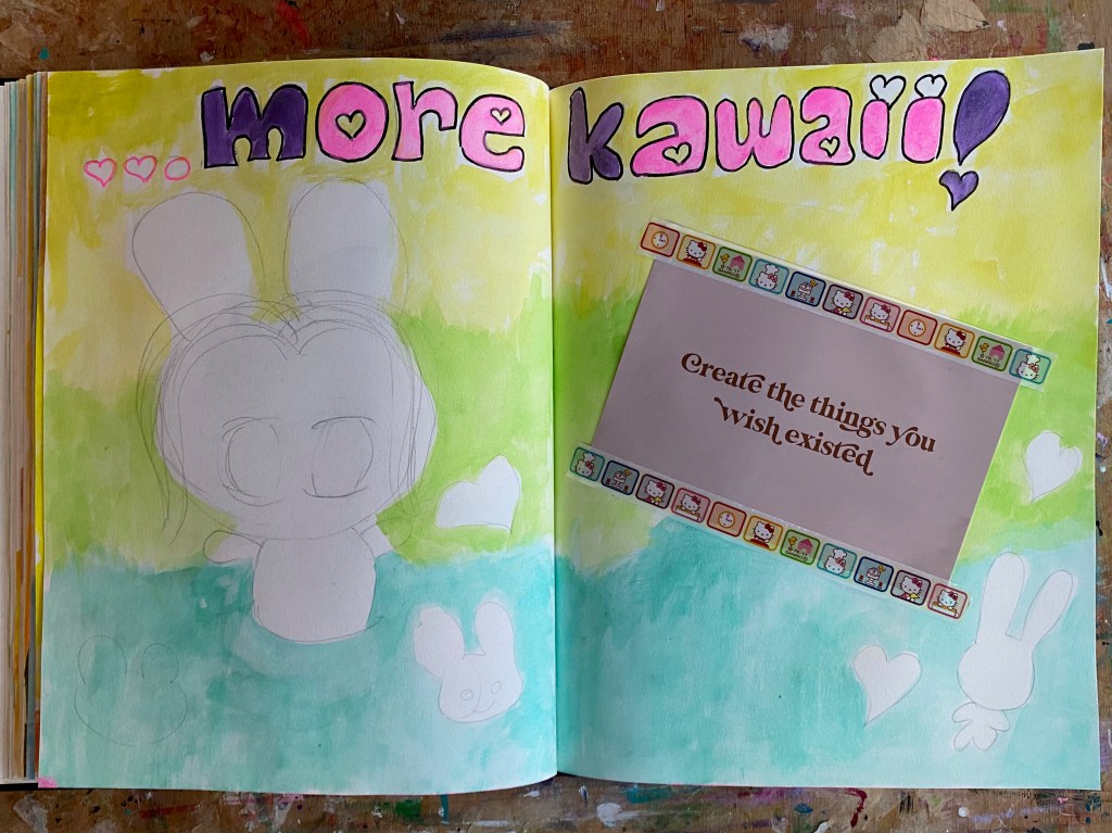 And what a fun session this was! Since I have tons of Hello Kitty and other cute stickers and washi tapes as well as tags from toys, it is always great to make some use of them and create some art with them. This kind of art journaling is a great break from solely painting and drawing whilst being able to express what’s in my mind. And of course I love creating kawaii but would love to create even more!