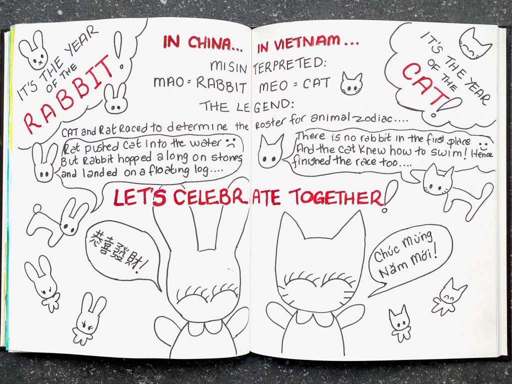 Wait a minute. It’s the Year of the Cat? No way, it’s the Year of the Rabbit now, isn’t it, there is no such thing as Year of the Cat. Oh yes there is! Not in China, but in Vietnam. I was also surprised to discover that when I was scrolling through Facebook. Both follow the Lunar Year and celebrate New Years on the same day, so what’s the deal about the cat? We’ll soon find out! Meanwhile, let the two fight it out, we say. And so this doodle I made, only this time the two peacefully make up in the end!