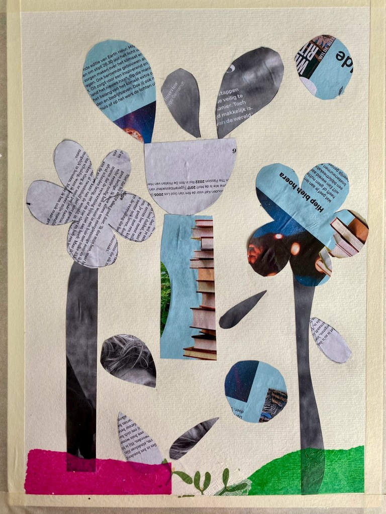 What I look forward to about Juliette’s classes is the various ways in which we get started with a painting. We typically begin with the background by playing around with different mediums and methods, layering over and over till we are ready to introduce our character. Even then, the painting evolves as we progress. This lesson, “Adding Whimsy” starts with gluing on some random cut-outs of our favorite shapes from scrap paper onto our substrate before incorporating more collage paper from colored tissue. Whilst Juliette has used an old piece of cardboard paper from a box, I unfortunately had just disposed all my cardboard boxes to recycling so merely replaced that with an A3 sheet from Canson’s Mixed Media sketchbook. Paper wonderfully thick at 300gsm.