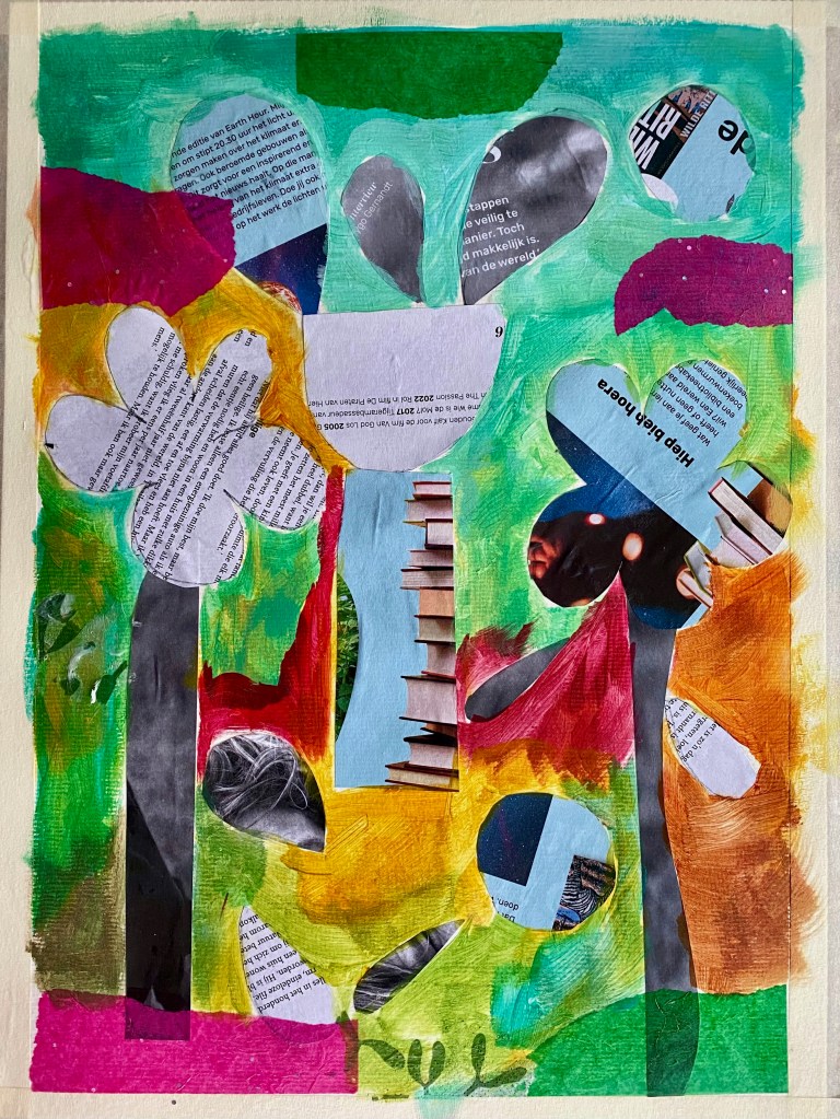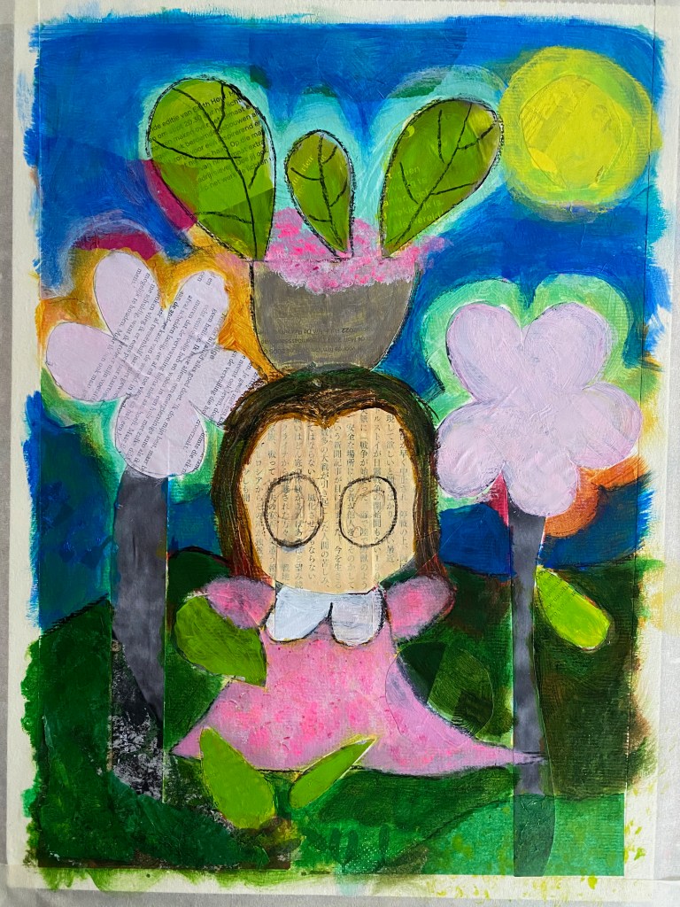 I decided to take advantage of the teardrop-like shapes and paint them as leaves. And of course there are those two large flower shapes. The circle on the far right would become the sun, and the elongated semi-circle would be the flower pot. Now I was ready to introduce Little One! I covered up the vertical rectangle in the middle by creating the face with a cut out circle and painting on it. Then the rest followed: Painting the sky with a combination of Cobalt Blue and Phthalo Blue with a bit of white, followed by Sap Green Hue and Permanent Green Light for the ground. The big flowers were then filled in with Light Rose with the dress a darker shade of pink Then the leaves were filled in yellow green. As you can see, some fluorescent pink was lightly dabbed on the dress and flowers in the pot to give brighten up the painting more.