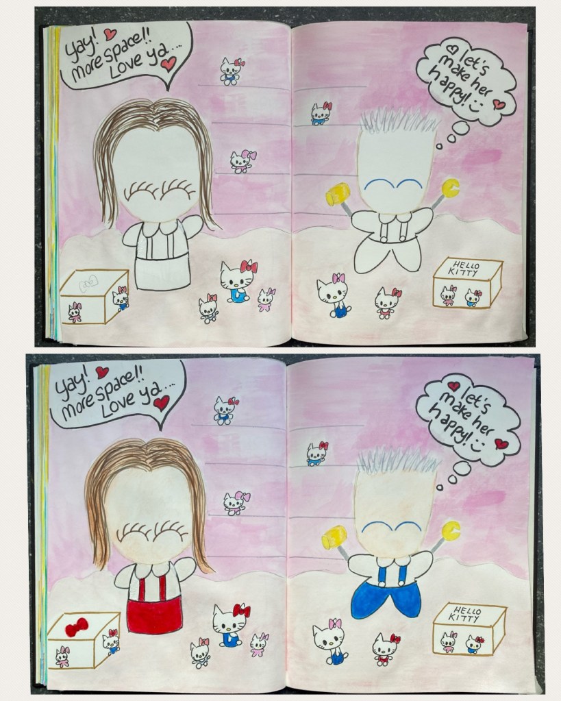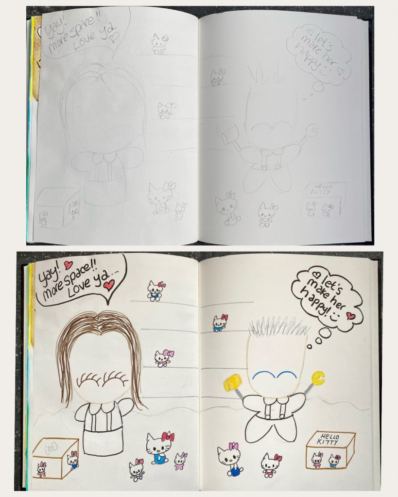 Decided to make this sketch in art journal form and hence began my sketch on a two-page spread of my Strathmore’s sketchbook, starting with pencil the going over the outlines with Faber Castell’s Pitt Artists Pens. Me on one page, him on the other with the shelving in the center. Boxes on the floor, and a few Hello Kitty’s propped on the shelf. So far so cute!
