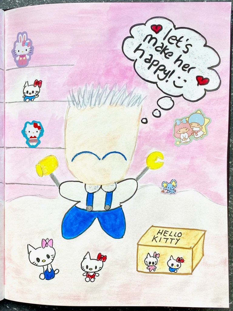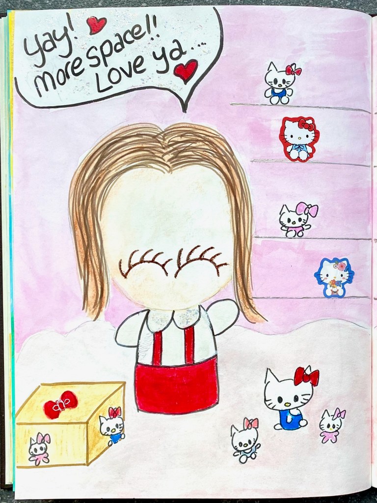 The past few weeks have been busy as well. Whilst organizing the house more, I also began organizing my Hello Kitty collection! I have quite an extensive collection and my sweet and supportive boyfriend figured they should be displayed so I can enjoy them more. When we moved to our new home two years ago, he had promised to build some glass shelves in my designated Hello Kitty room which doubles as a study. It was an ongoing project all this time as we both prioritized the more important stuff for the house, but we finally managed to let it happen! And of course, I must sketch and paint about it…