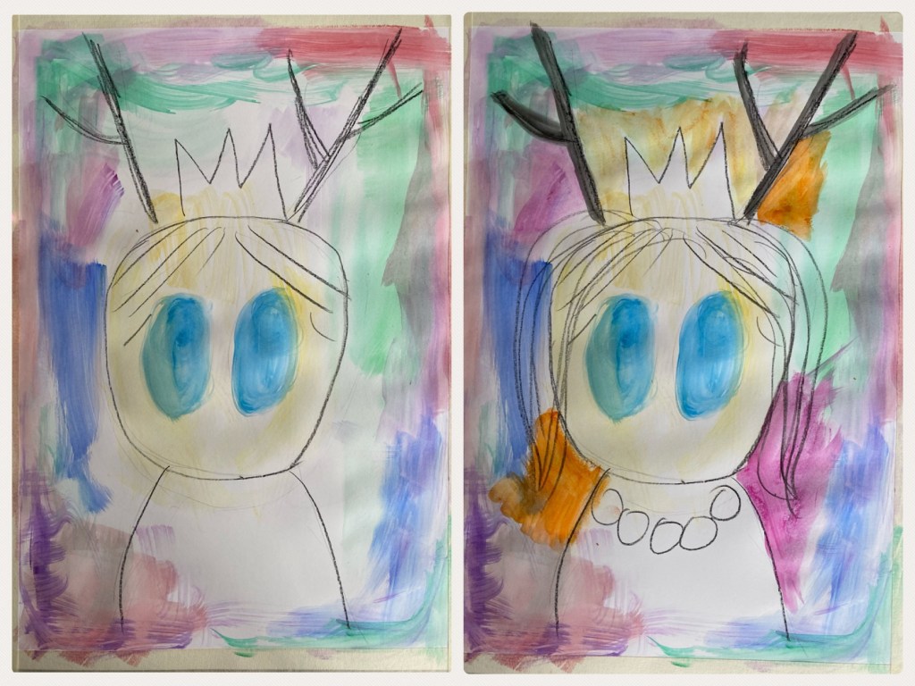 Little One is dressed up again! And what have we here? A pair of reindeer horns along with a shiny crown on her head. And with a red robe she’s got some huge beaded necklace for some added effect. She still looks sweet doesn’t she? The reindeer horns and the large necklace somewhat reminded me of Vikings, although I’m not entirely sure if that’s an accurate description of them. So Viking Girl it is! This I painted whilst following the next lesson of Juliette Crane’s Serendipity I classes, “Keeping it Simple”. For a change, this lesson is less intensive compared to her other sessions but also fun as we shall see…