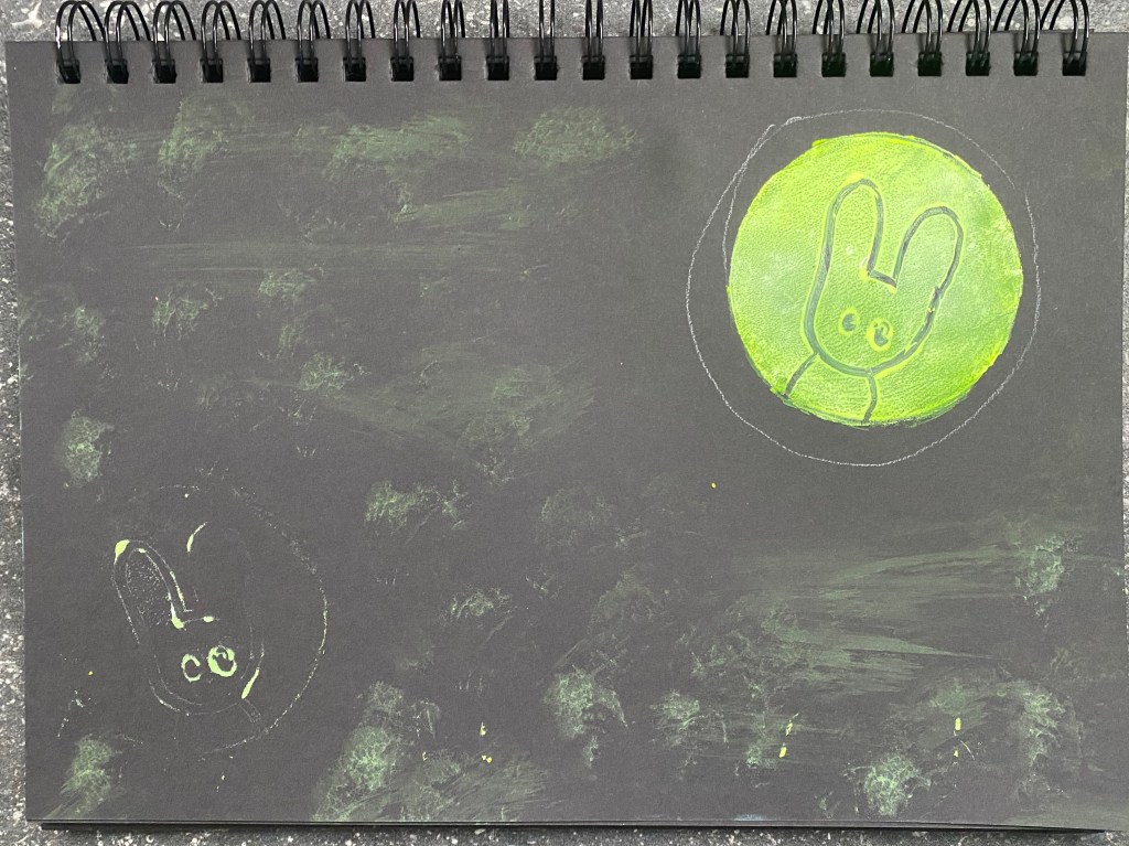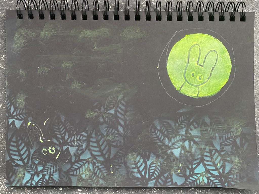 It is always fun being able to integrate some mixed media craft into my paintings such as printing and stencilling. And why not? I think it adds another dimension to the painting, don’t you think? To make it even more interesting, an A4-size Art Gecko black paper sketchbook was chosen. I firstly created the moon with some Gelli arts printing using a small round plate and blending some fluorescent yellow paint acrylic by ARA and Acryla gouache by Holbein and for a chalky appearance, a few drops of white ink. Then just for some added kawaii, the Rabbit in the Moon was developed by drawing a bunny in with a cocktail stick on the paint. And why a rabbit in the moon? It is an Asian myth we grew up with, as the shadow on the moon’s surface supposedly resembles a rabbit pounding some rice. How sweet is that! I then smudged a bit of the leftover paint on the sky with a wet wipe and made a ghost print on the bottom to add some mystery. So far so cute!