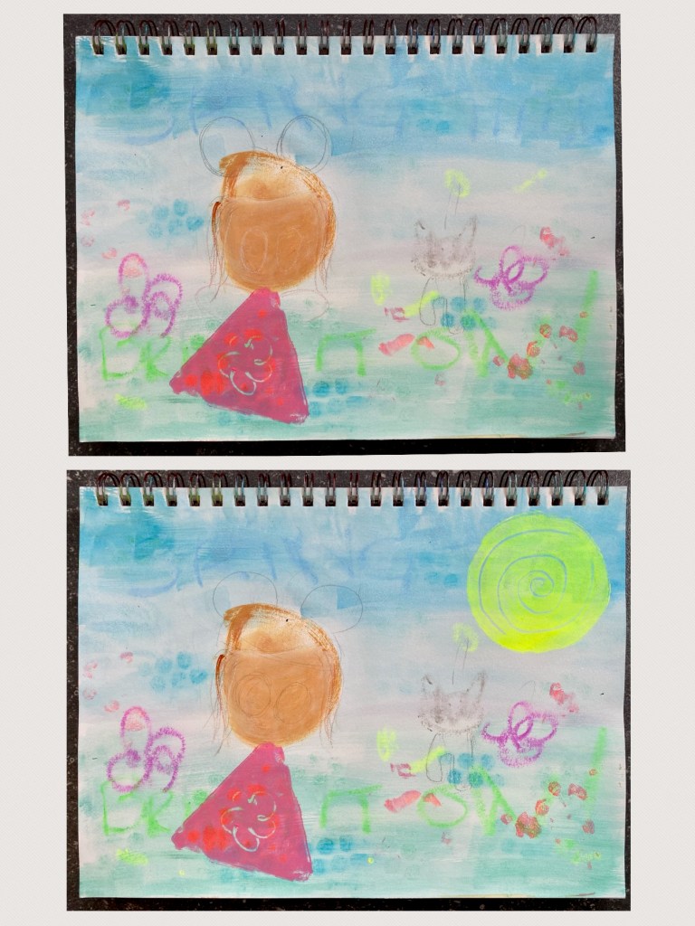It’s not often that I get to make prints, and as I was in the mood for it, I thought it would be an idea to incorporate some. Gelli plates was a logical choice here given the simple shapes. First I went for the small triangle as the dress with some pink and fluorescent red acrylic paint with a little flower doodled on it. Then I went for the small circle with fluorescent yellow for the sun. The excess paint was made as ghost prints on separate papers for other projects!