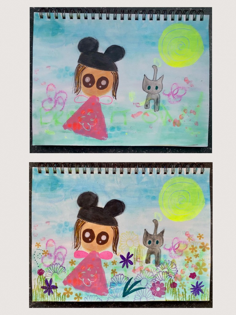 And now… we need to complete this piece with some minor details. The first thing was the hat: It is not a Mickey Mouse head, but was intended to be a black wooly hat with two pompoms. Failing that, I chose to embellished it instead with some glitter pink gel pen scribbles on the ears and a cute Hello Kitty sticker so the pinks would match the outfit. Eyelashes were then carefully drawn in with glitter glue, whilst the cat’s face completed with white gel pen. Finally, the centers of the flowers were adorned with gel pens, glitter glue and Fluorescent Red gouache with a bit more flowers and leaves doodled in with metallic gel pens. And now we have it!