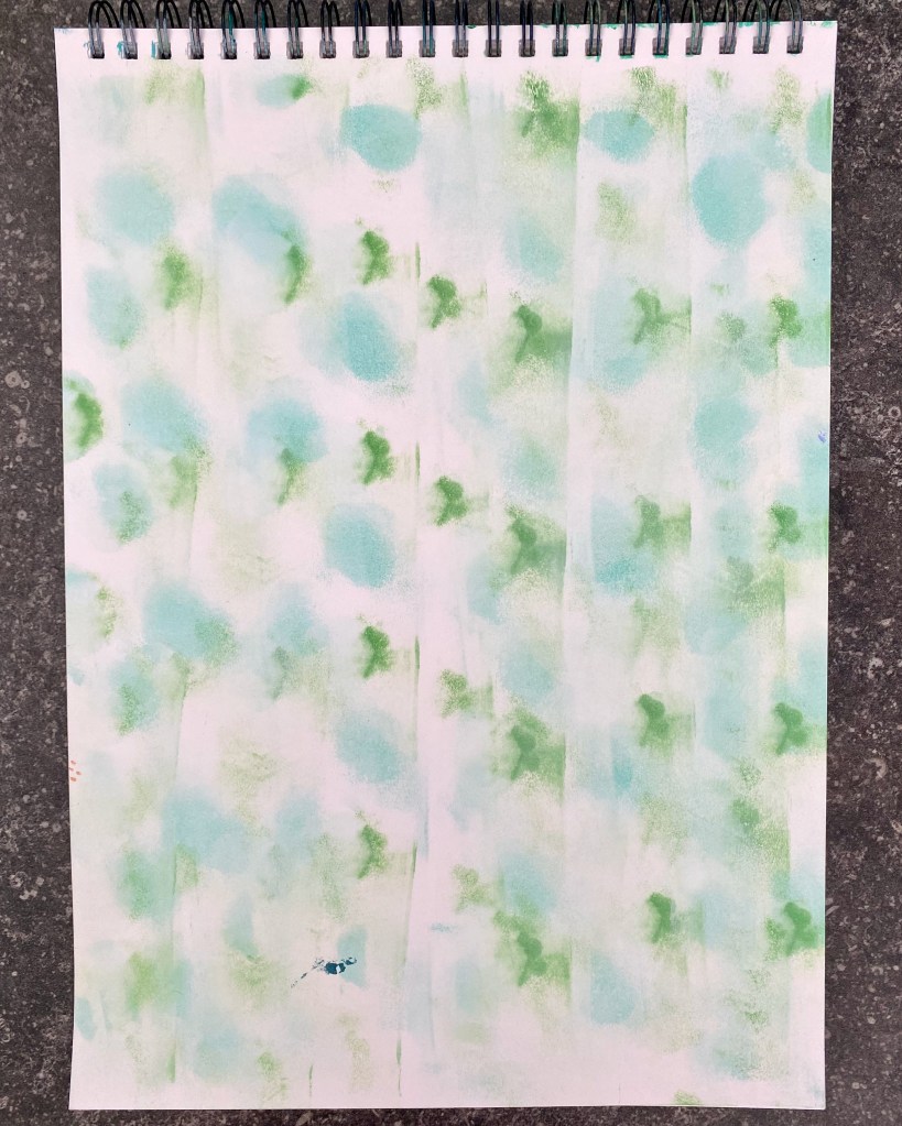On a page from my A3 Art Gecko Mixed Media sketch pad, I went about creating my background. I was hoping for some mint-green using a sponge roller. However, I not sure if I used too little paint or the paint was not thin enough to spread but I ended up with some round splotches instead! Not to worry, I thought, why not go over it with another roll of color? And hence I went for a mixture of titanium white and another evergreen and tried again. Failed that too! But not a failure, actually. It turned out to be an interesting look! I quite liked it and decided to keep it as is. Things do happen for a reason don’t they?