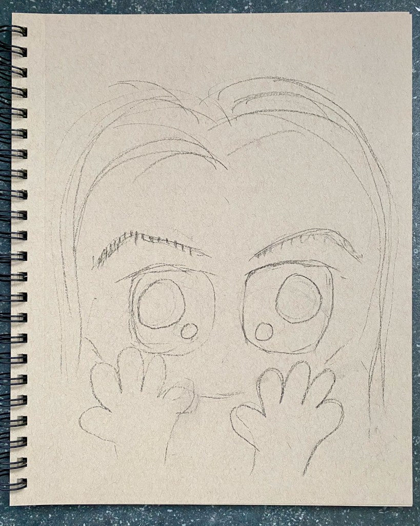 So let’s start with a basic sketch. It has been some time since using some colored paper apart from white or black. Enter some tanned paper! Here we have a page from Strathmore’s Toned Tan sketchbook on which I scribbled with some black charcoal pencil. I didn’t add too much detail as I was intending to color it in later. And what a cute portrait! The hands are of course round and pudgy but I figured that goes well with the image, keeping it all kawaii and chibi.