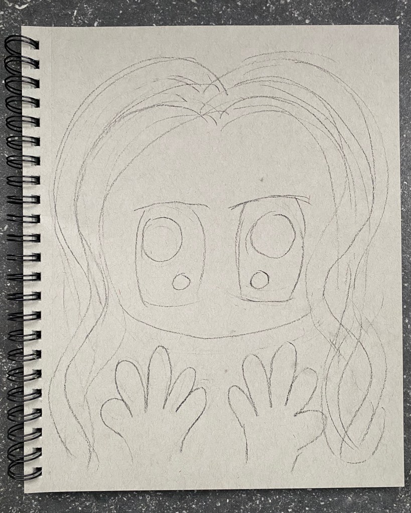 On a blank page from my Strathmore Toned Grey paper, I set about briskly scribbling my image with a charcoal pencil. Pretty basic here, only that I needed to erase a few times to get my eyes and hands reasonably even. Making the hair wavy was another thing as it is quite a change from my usual “Little One” hair style. Still, so far looking good!